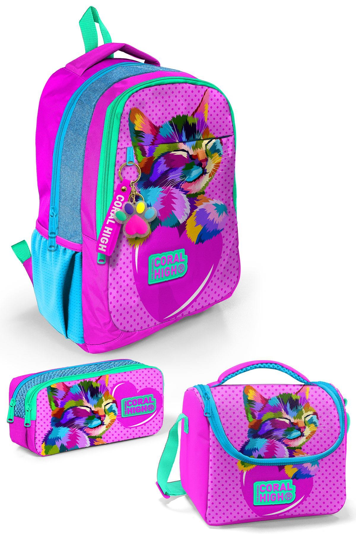 Coral High Kids Pembe Mavi Simli Kedi Desenli 3’lü Okul Çanta Seti SET014387