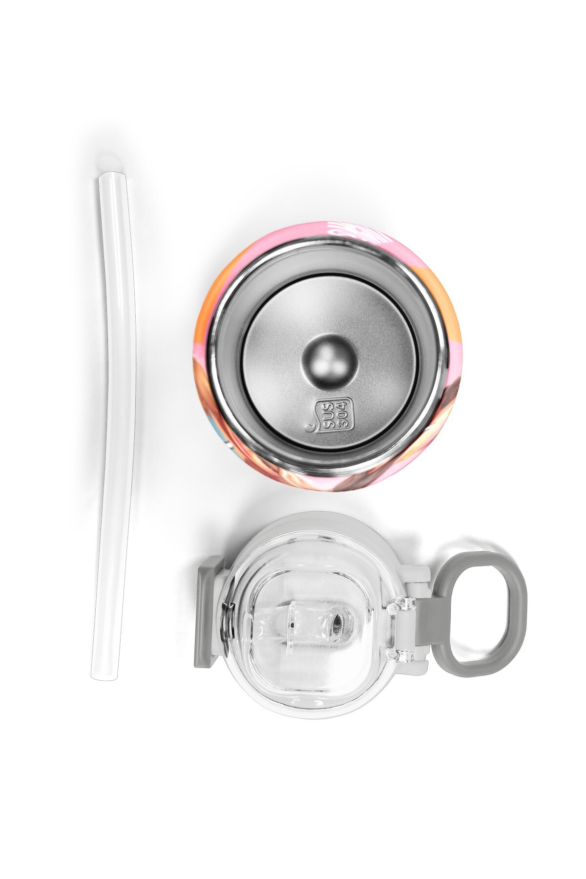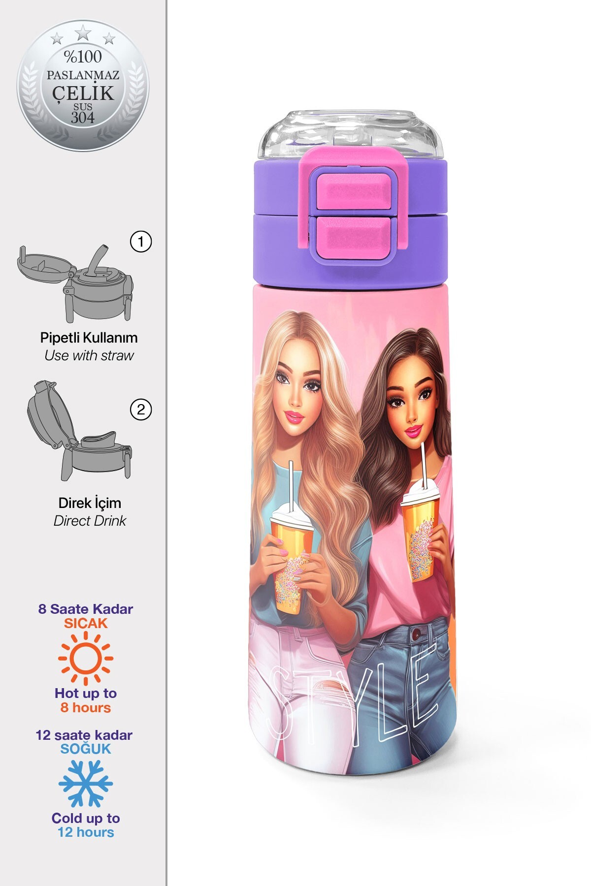 Coral High Kids Pembe Mercan Fashion Girl Desenli Pipetli ve Direkt İçim Çelik Termos 500 ml 31869