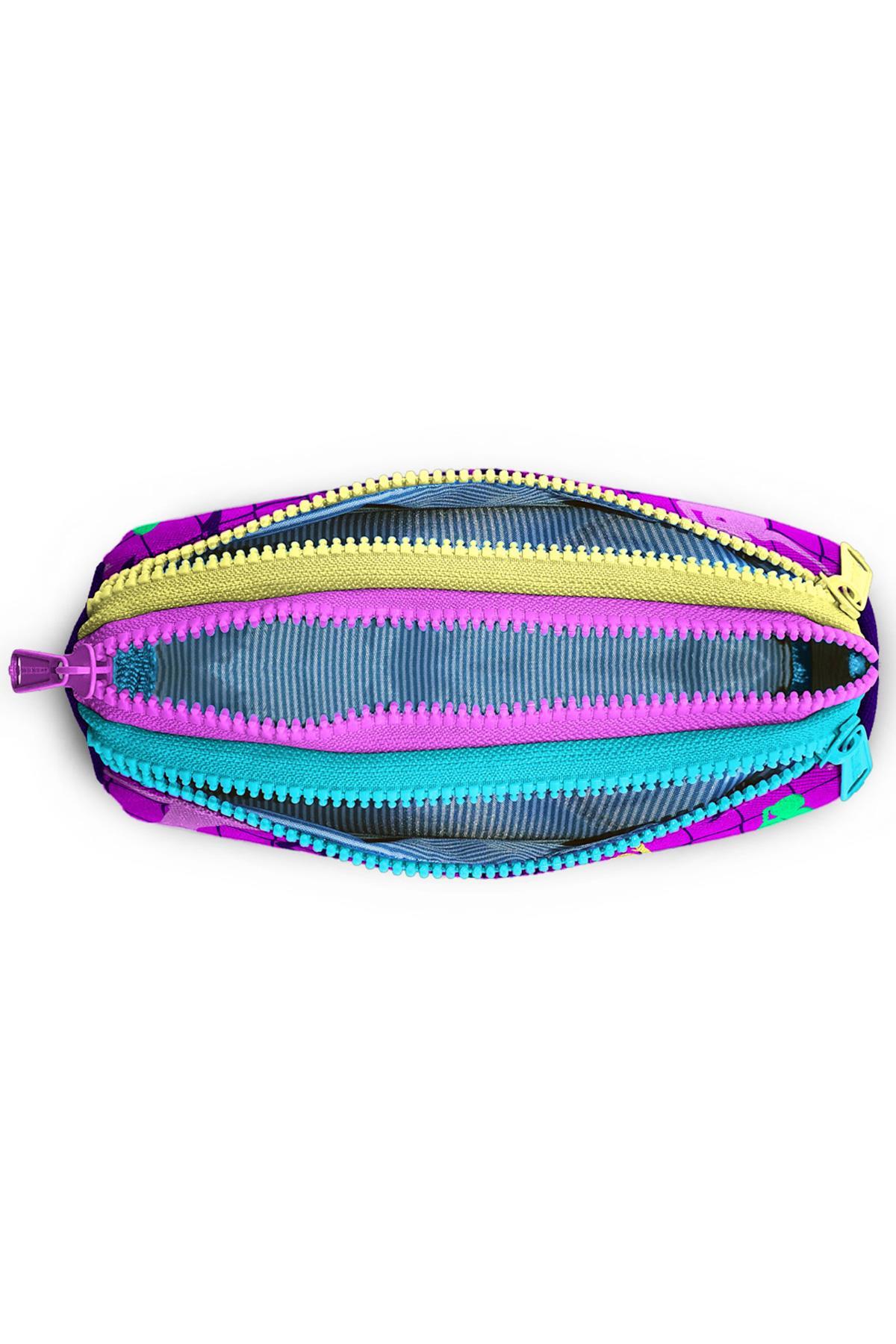 Üç bölmeli, fermuarlı kalem çantası.