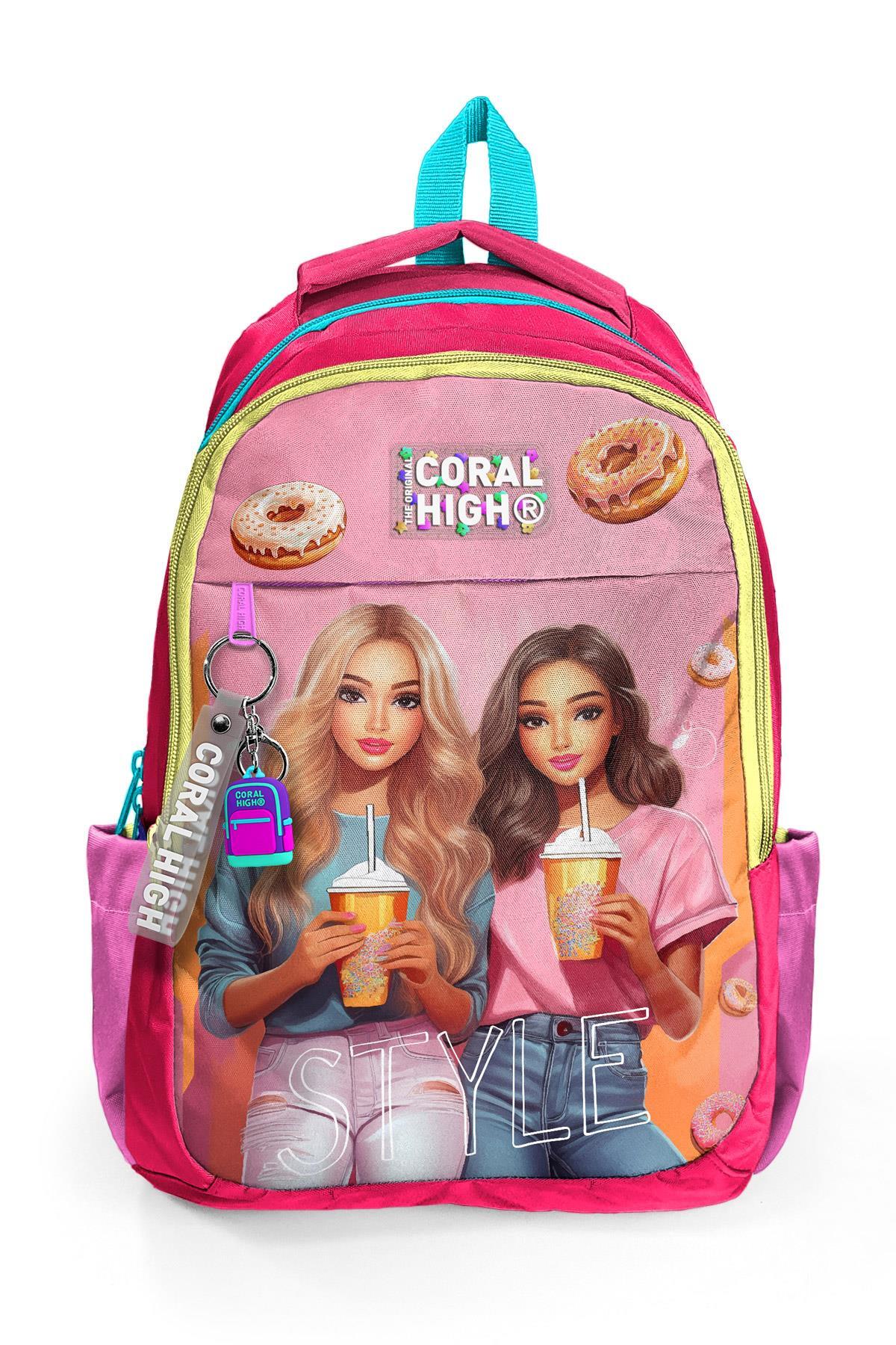 Coral High Kids Pembe Neon Mercan Fashion Girl Desenli Üç Bölmeli Okul Sırt Çantası 23669