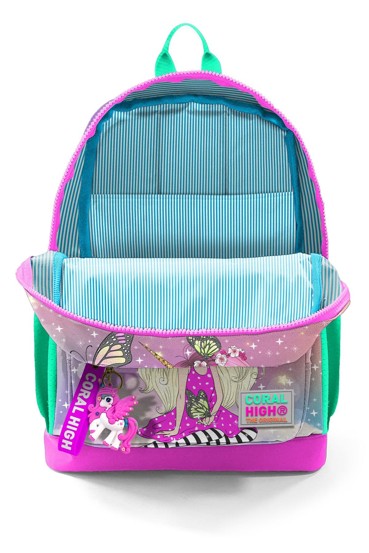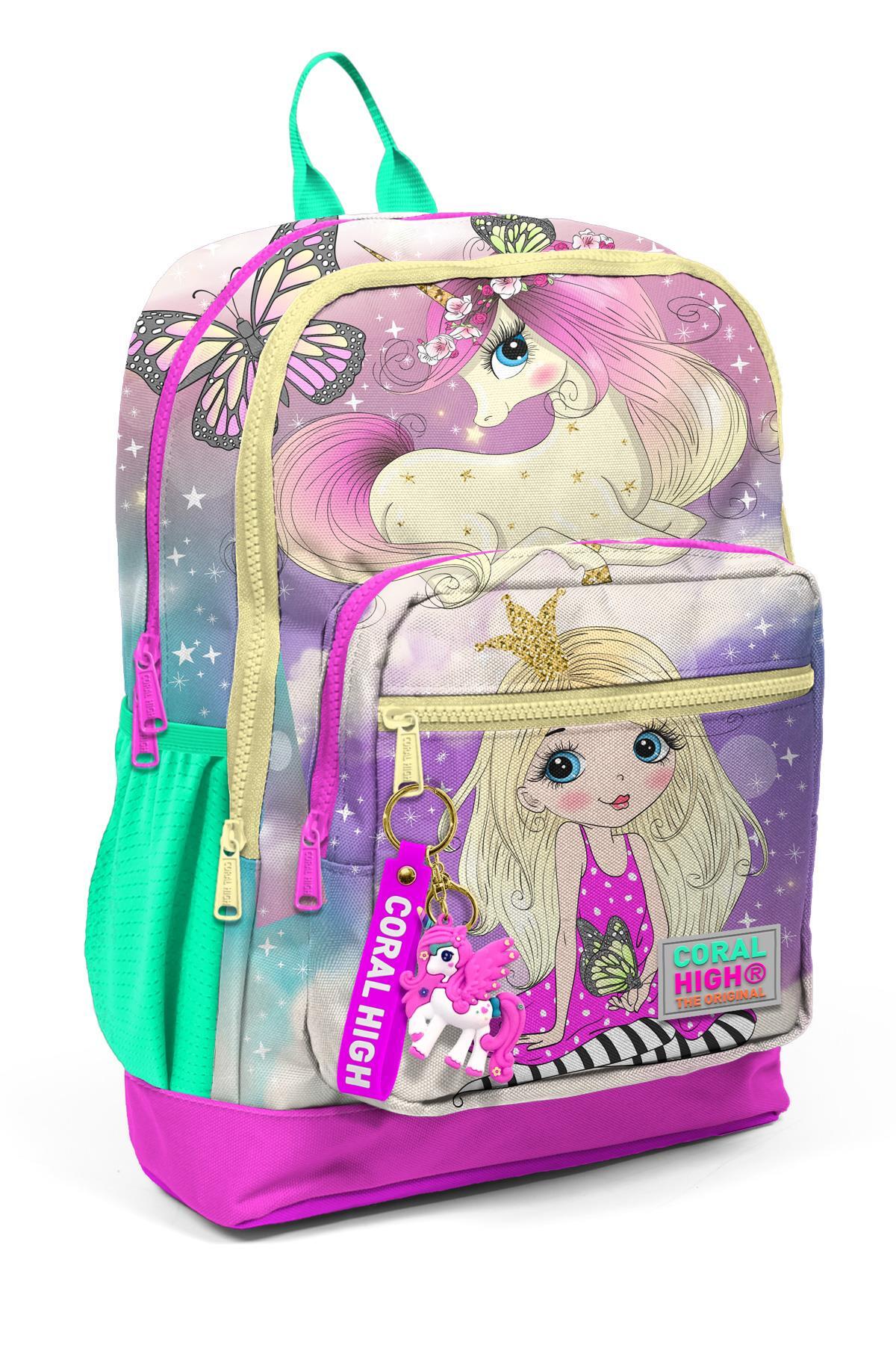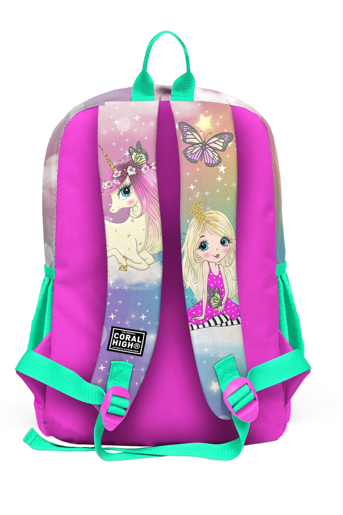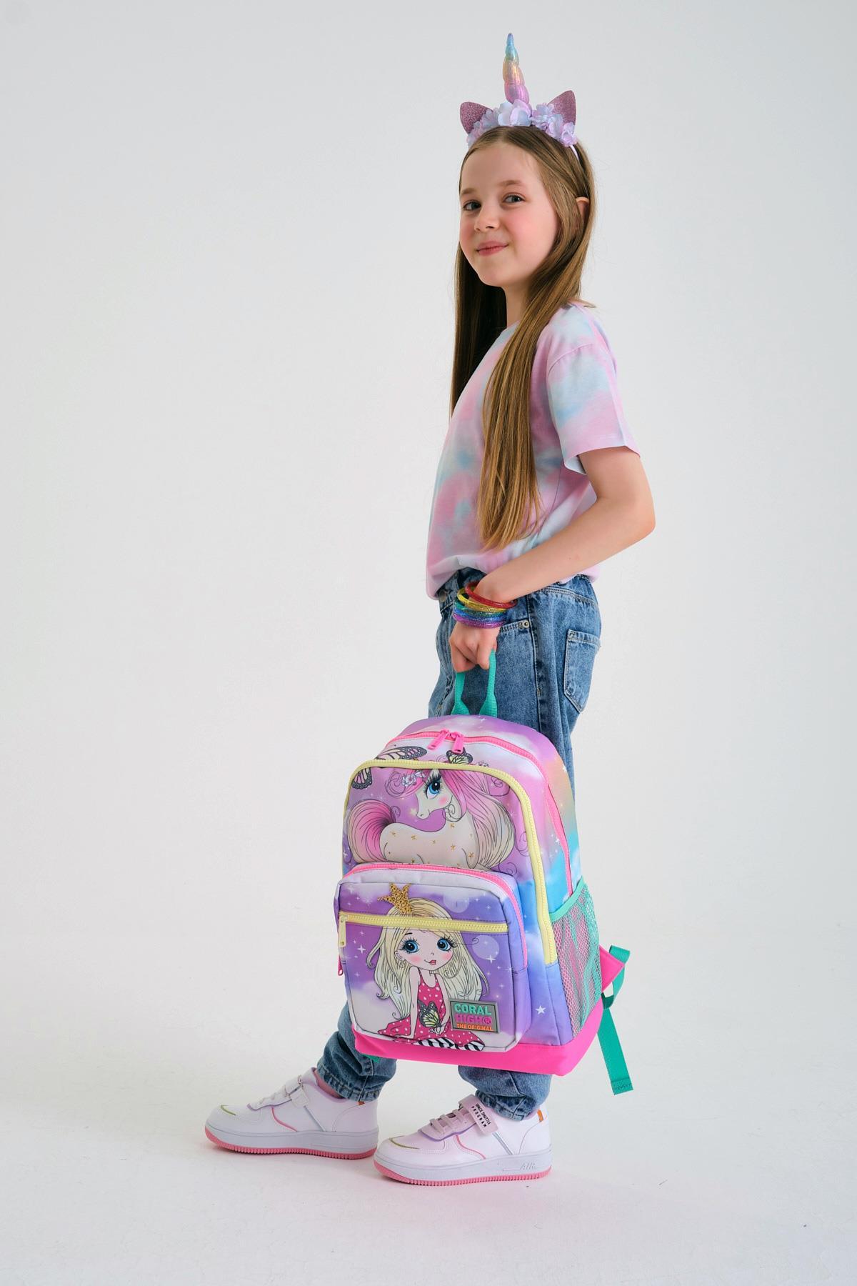 Coral High Kids Pembe Su Yeşili Unicornlu Kız Desenli Dört Bölmeli Okul Sırt Çantası 23733