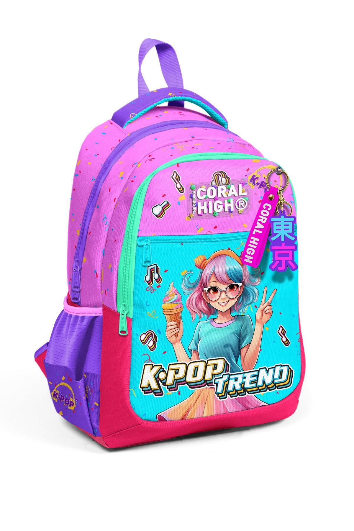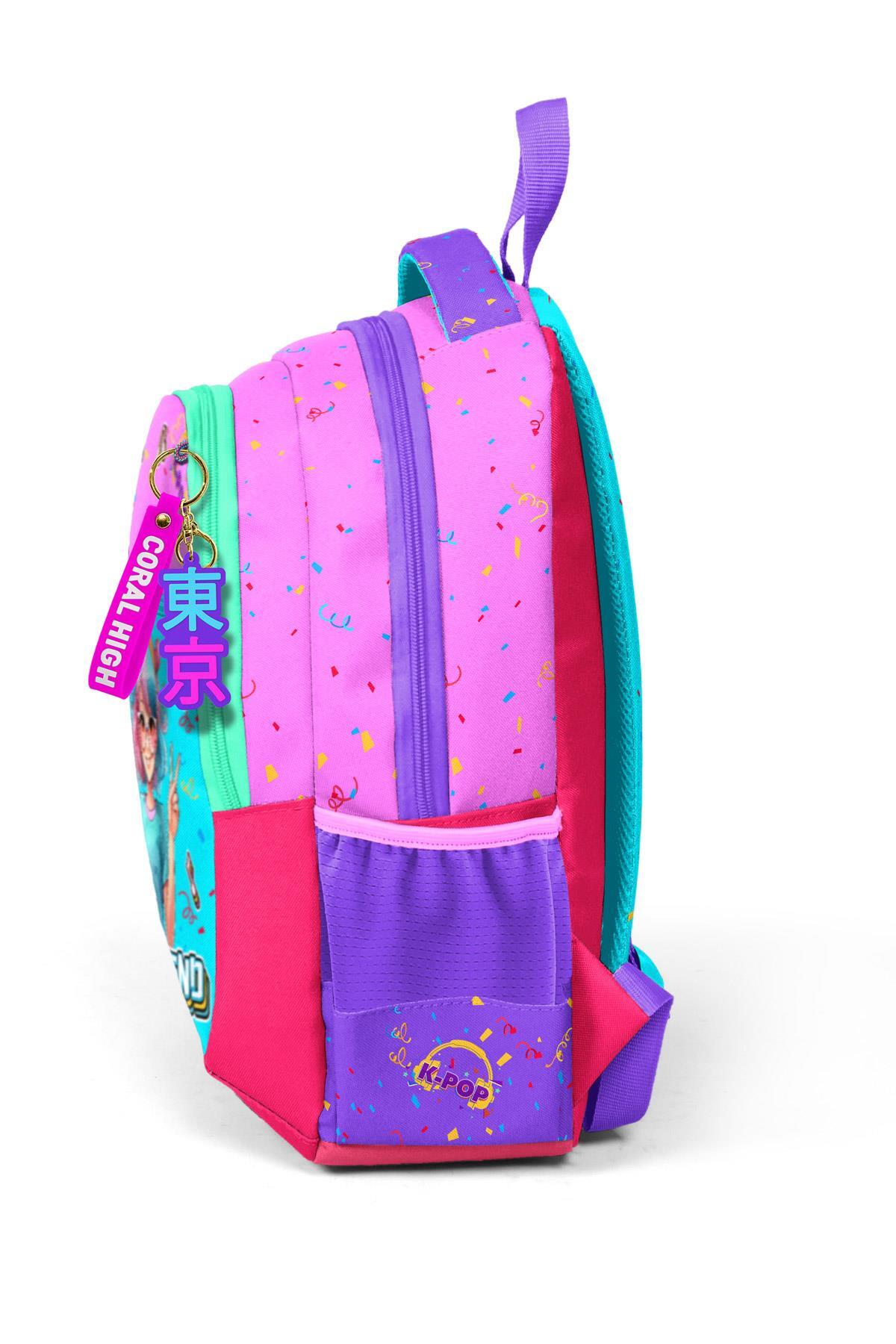 Coral High Kids Pembe Turkuaz K-Pop Desenli Üç Bölmeli Okul Sırt Çantası 14427