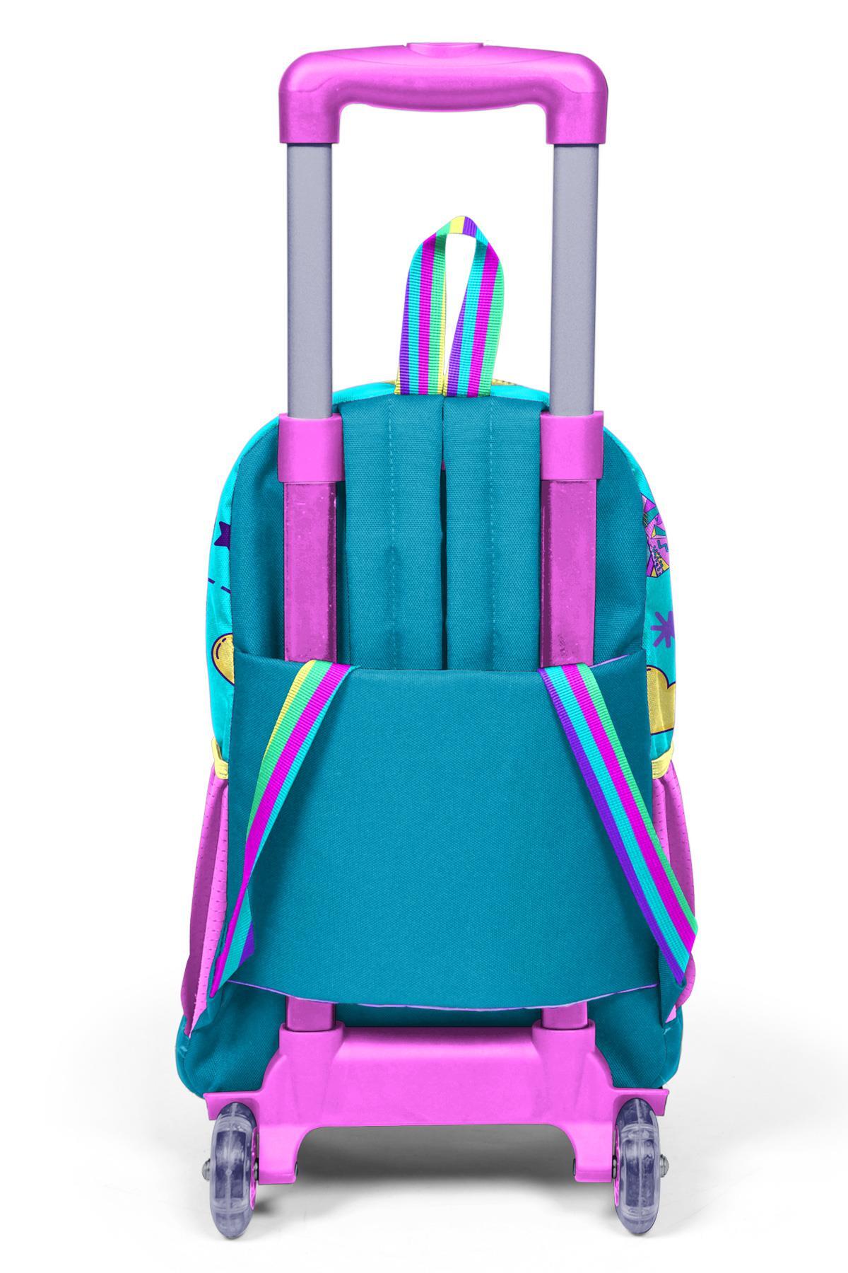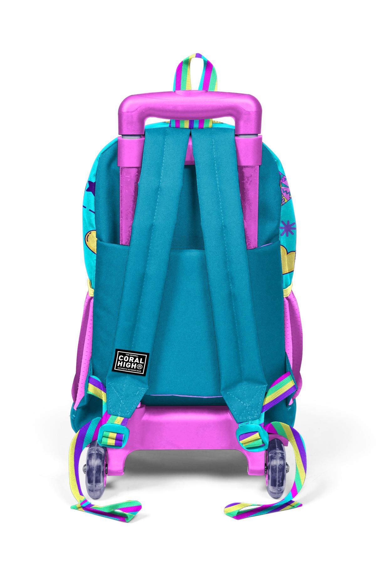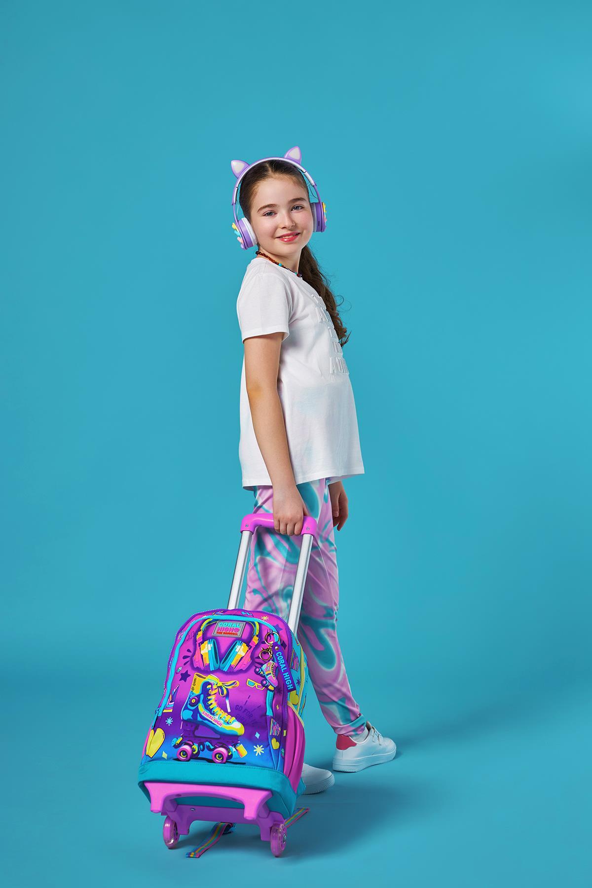 Coral High Kids Pembe Turkuaz Kulaklık Paten Desenli Üç Bölmeli Çekçekli Okul Sırt Çantası 23954