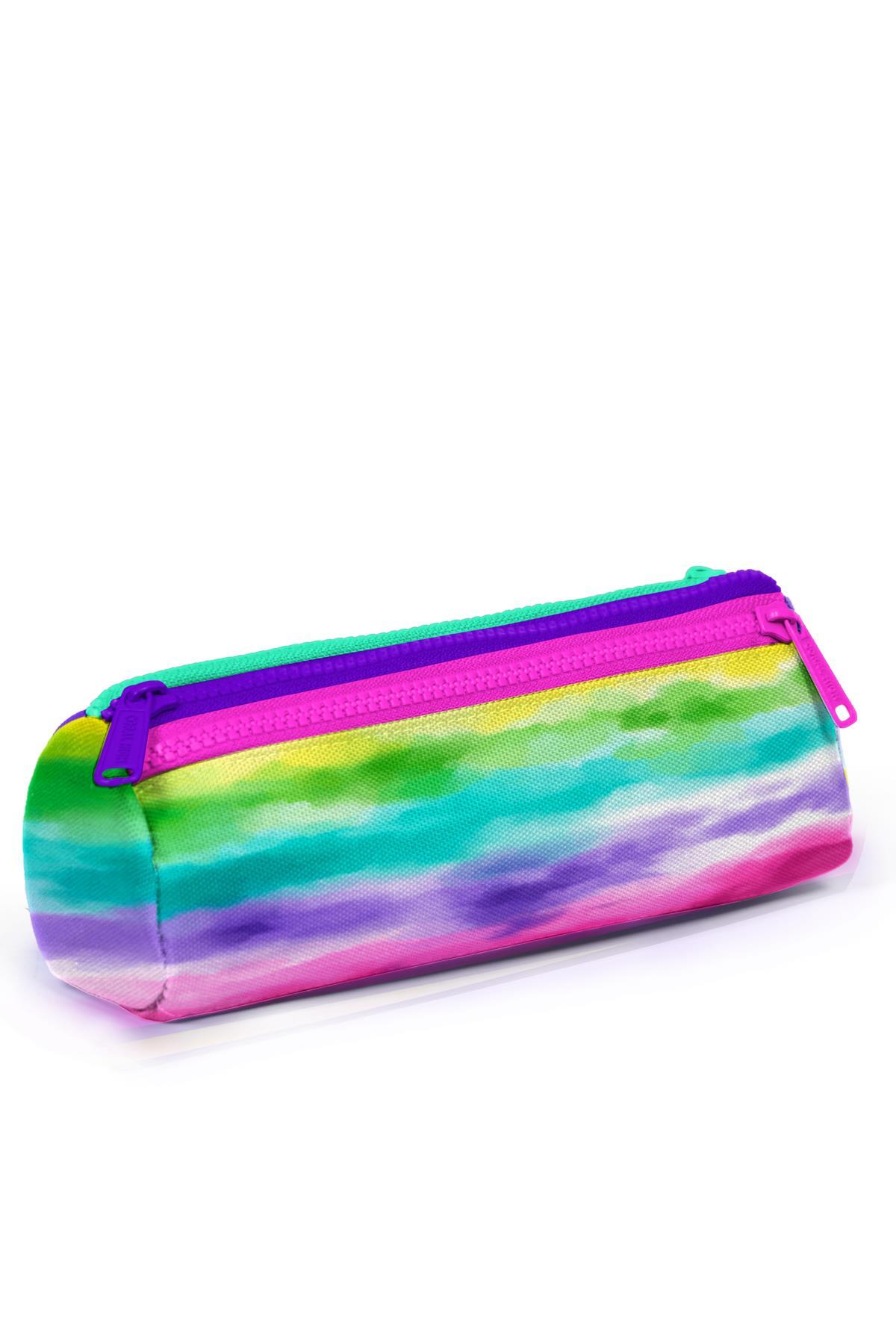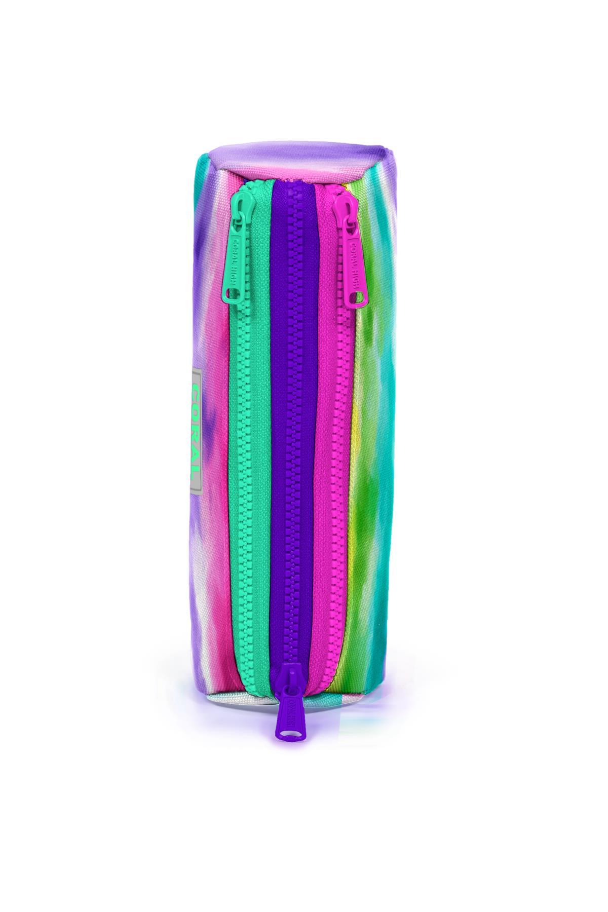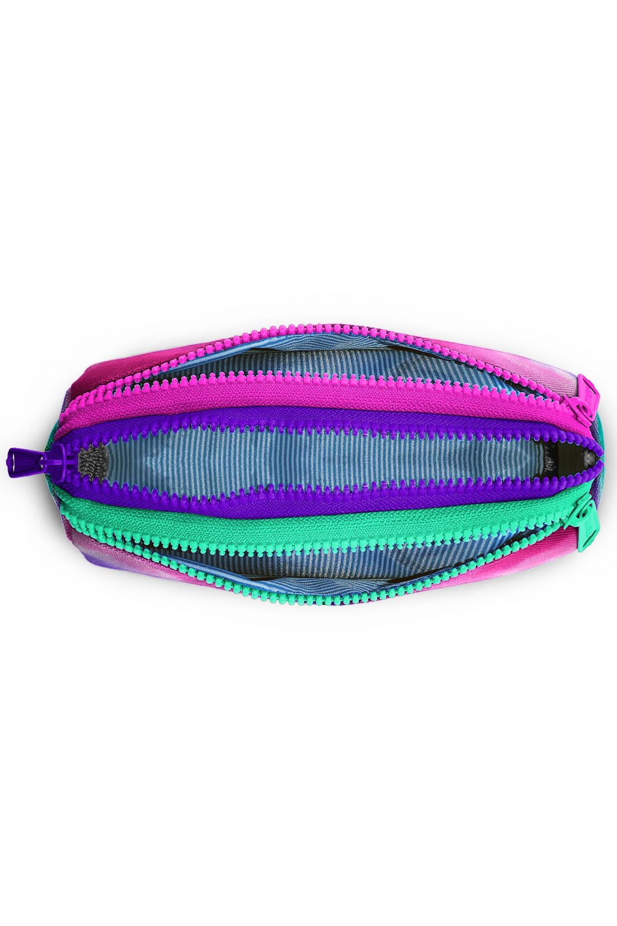 Üç bölmeli, fermuarlı kalem çantası.