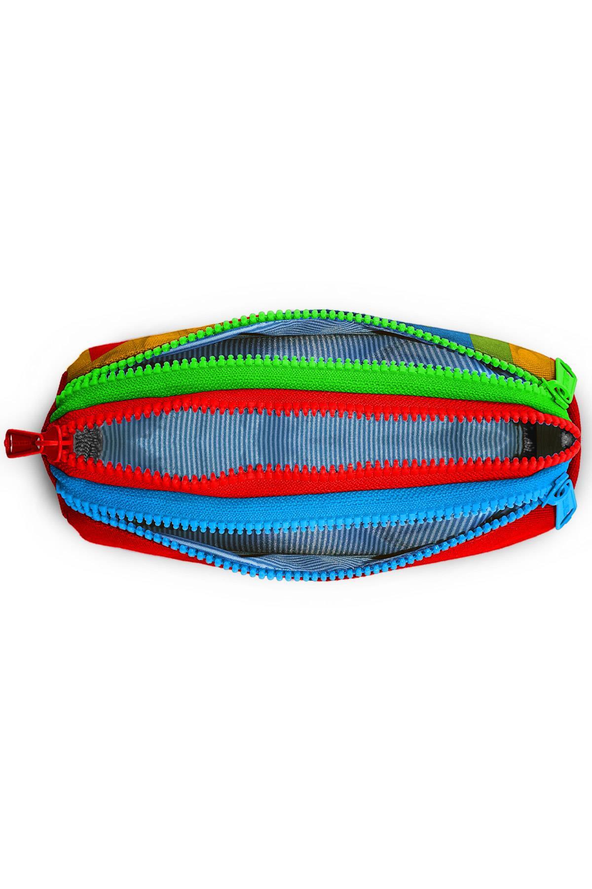 Üç bölmeli, fermuarlı kalem çantası.