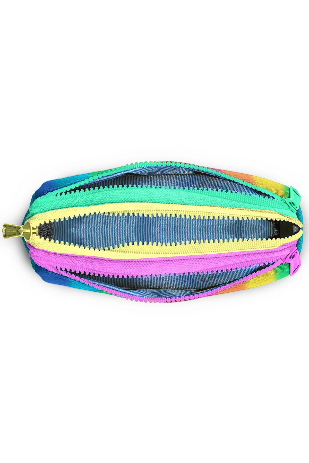 Üç bölmeli, fermuarlı kalem çantası.