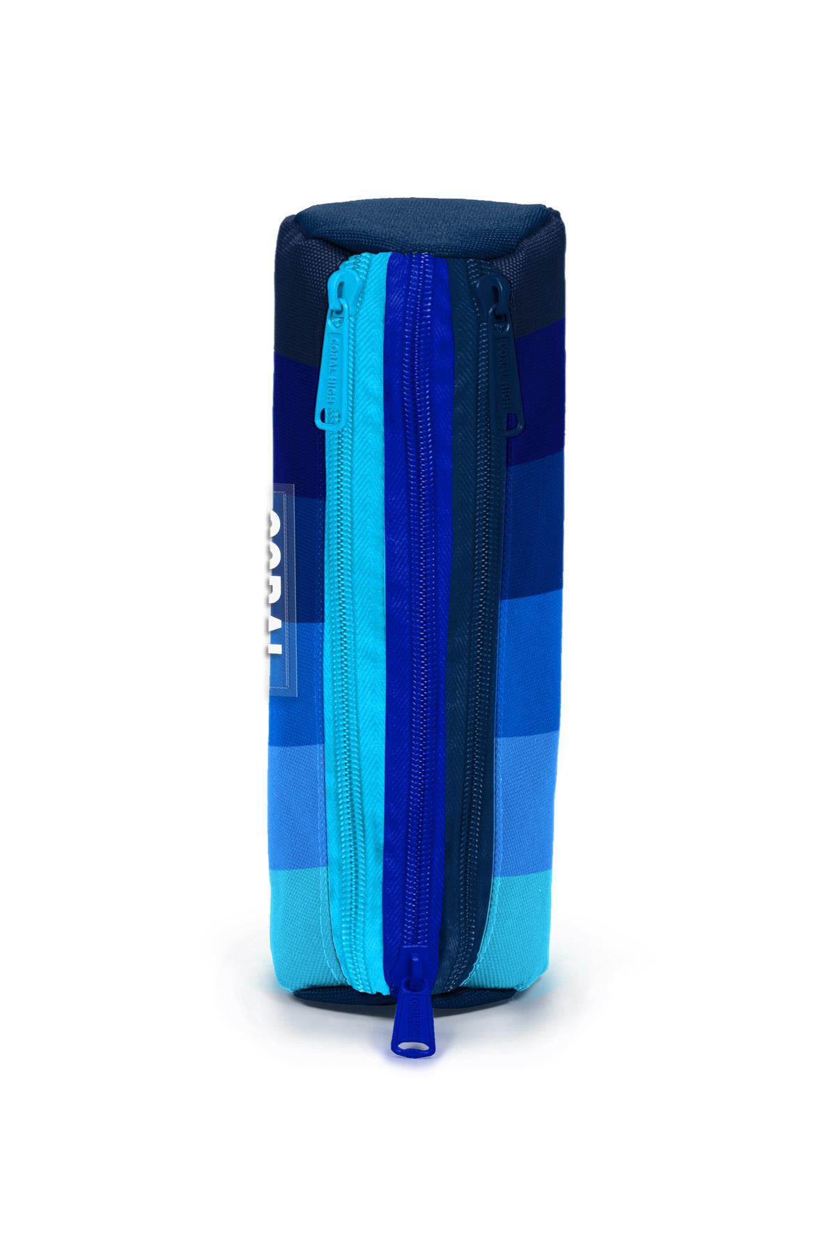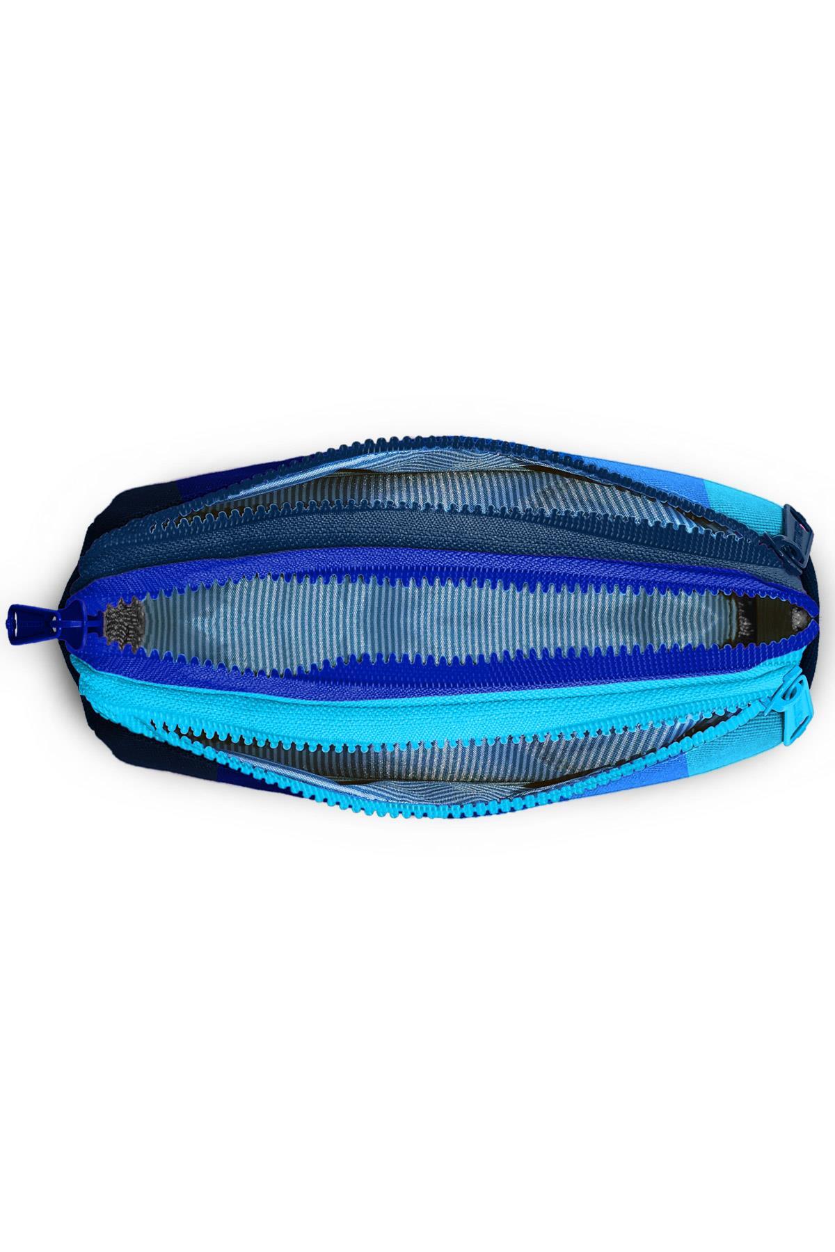 Üç bölmeli, fermuarlı kalem çantası.