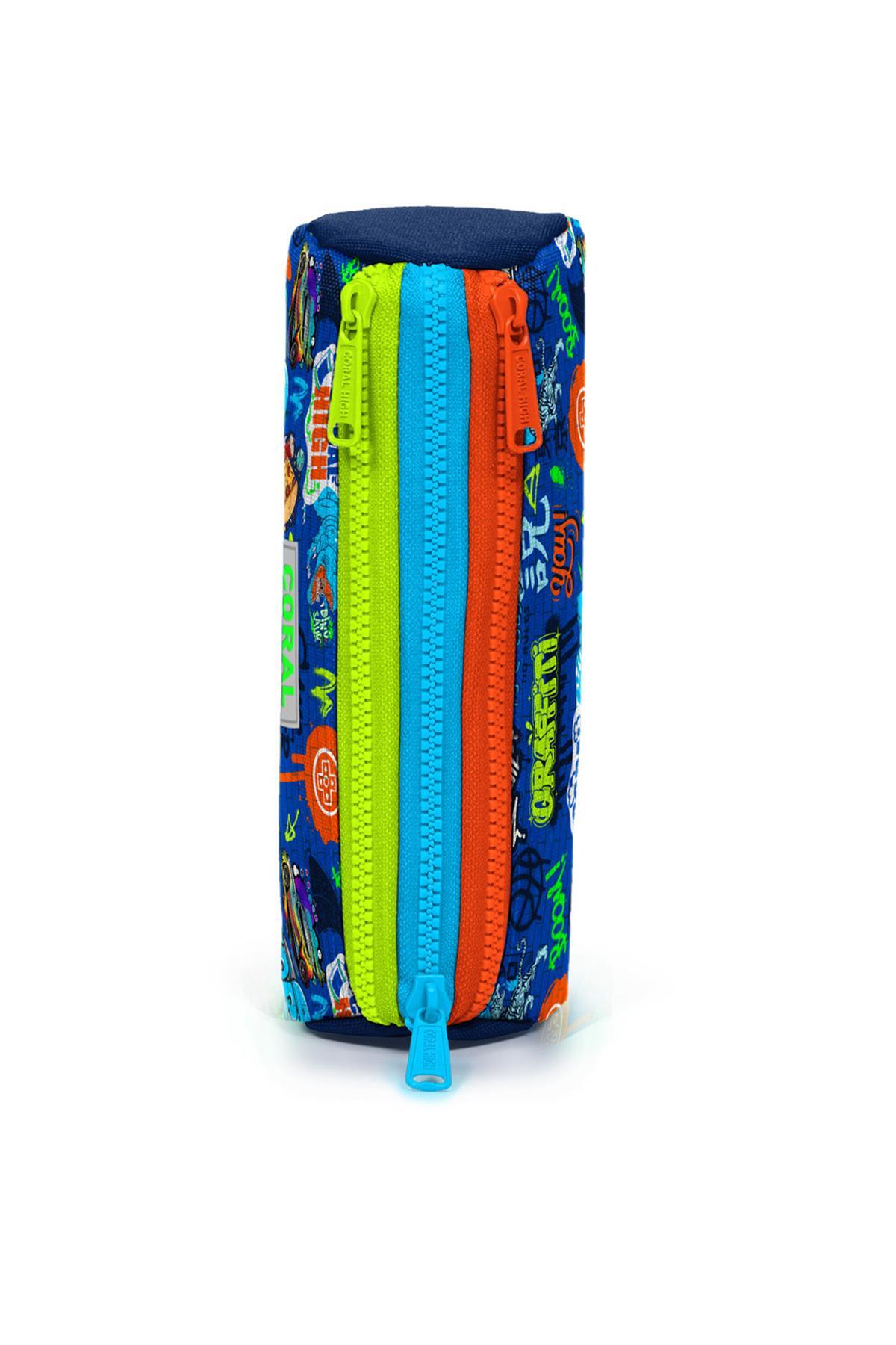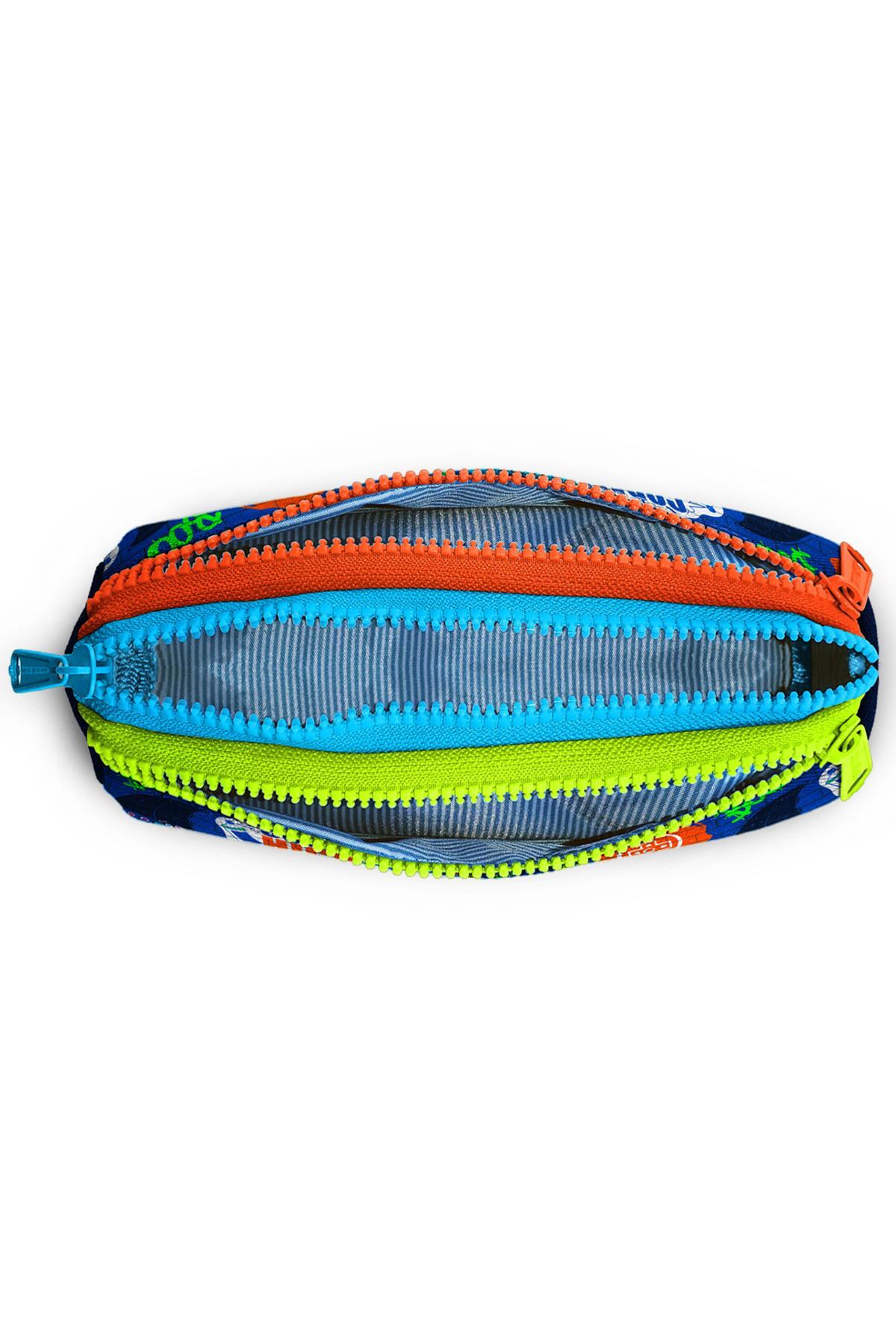 Üç bölmeli, fermuarlı kalem çantası.
