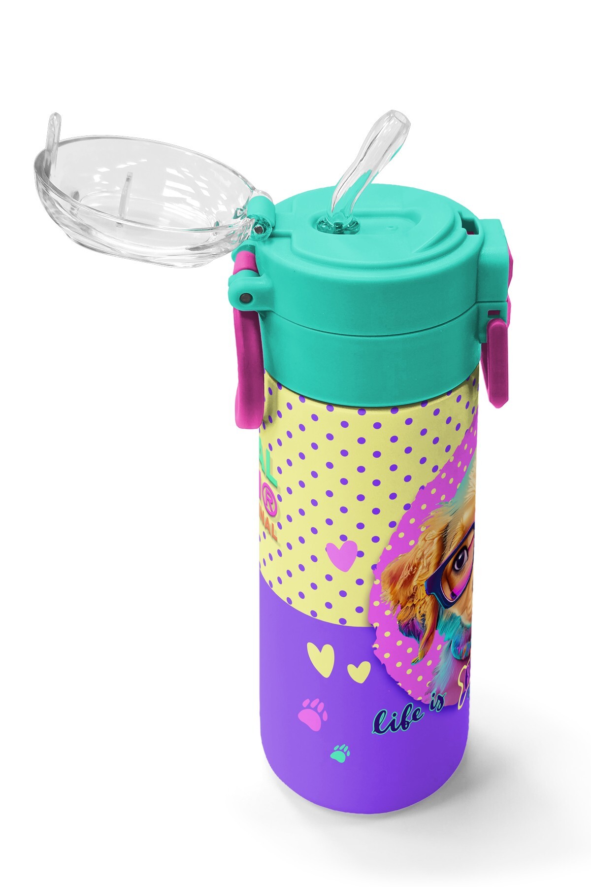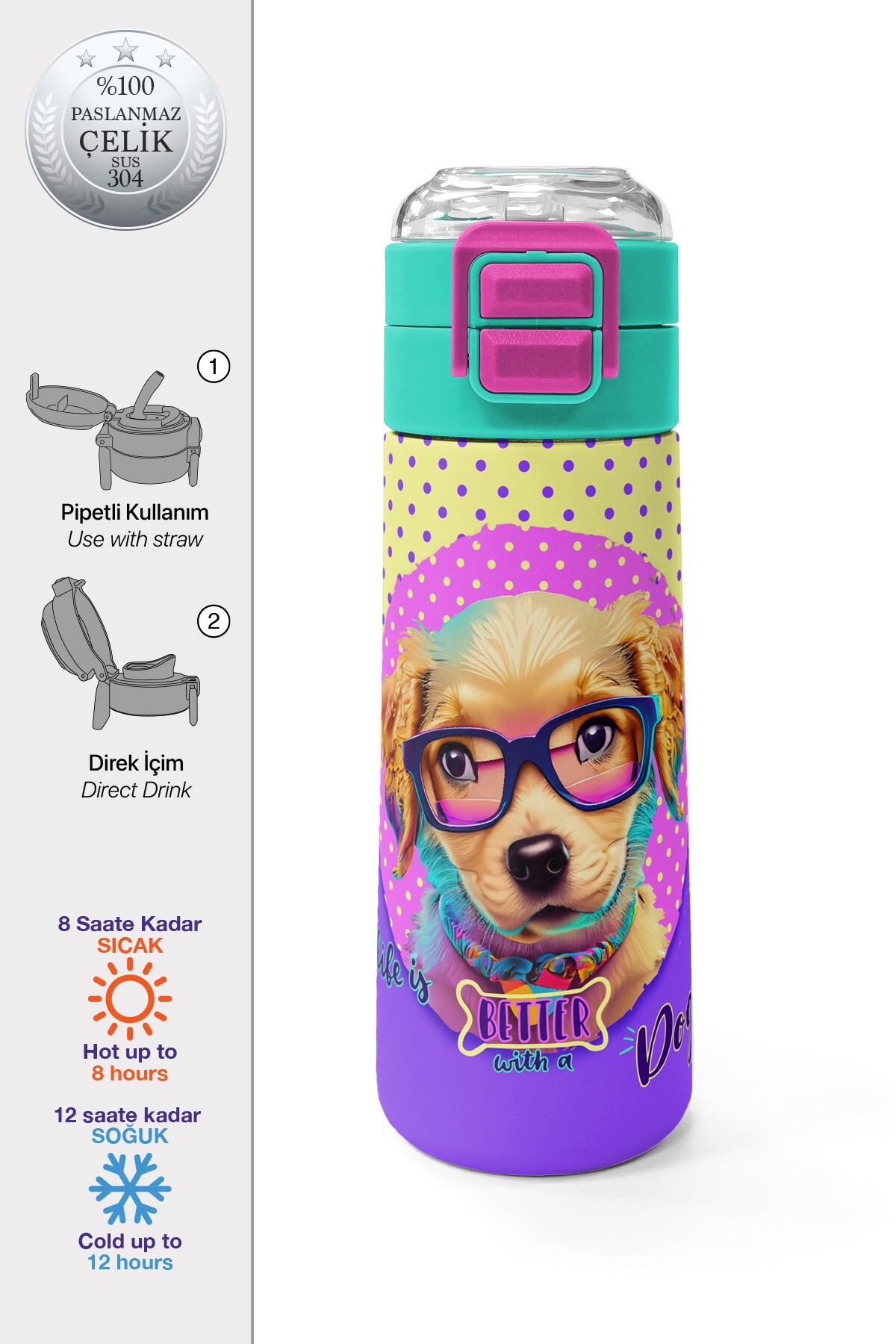 Coral High Kids Sarı Pembe Sevimli Köpek Desenli Pipetli ve Direkt İçim Çelik Termos 500 ml 31953