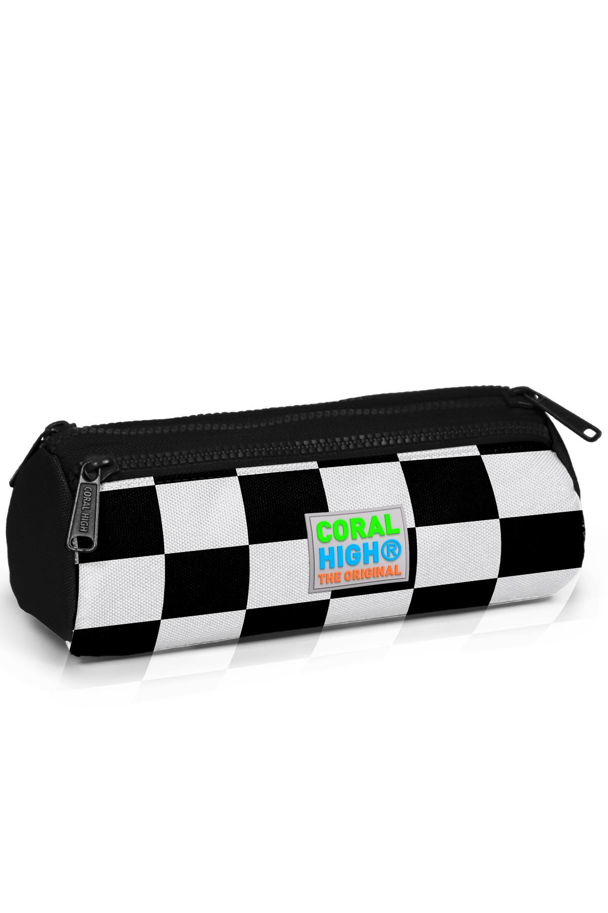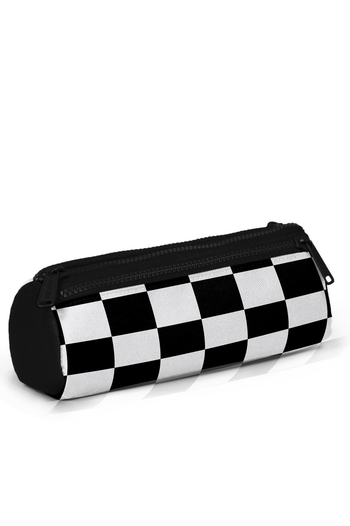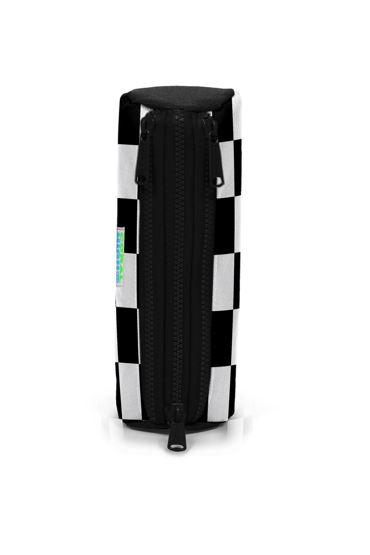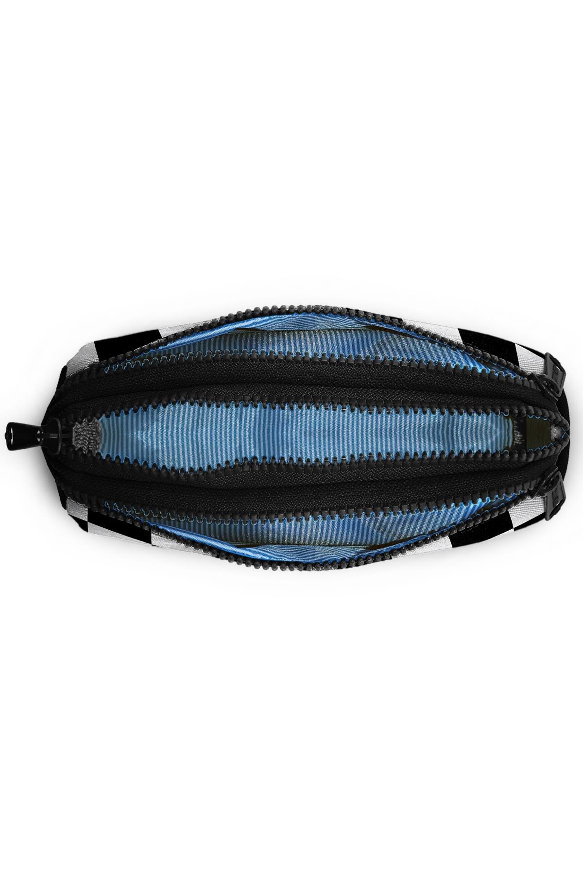 Üç bölmeli, fermuarlı kalem çantası.