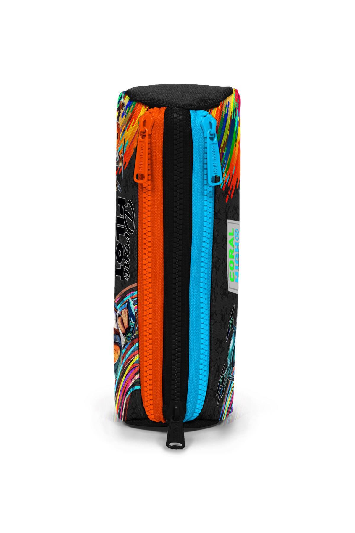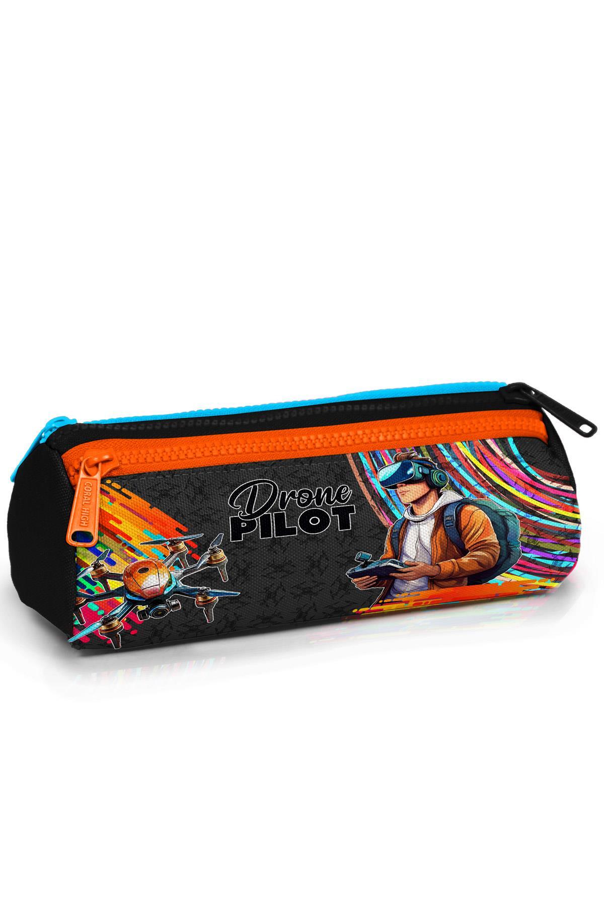 Coral High Kids Siyah Drone Pilot Desenli Üç Bölmeli Kalem Çantası 22096