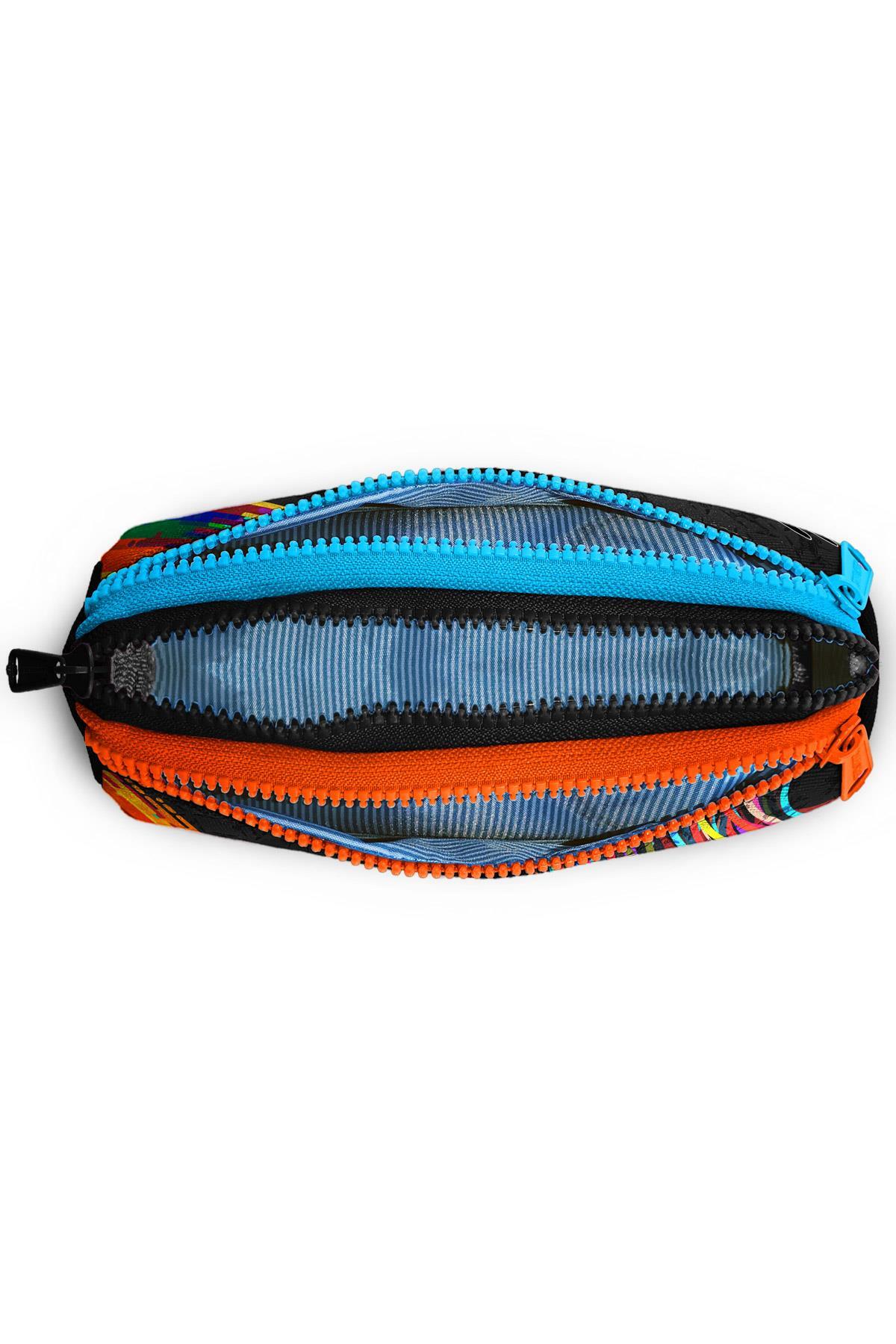 Üç bölmeli, fermuarlı kalem çantası.
