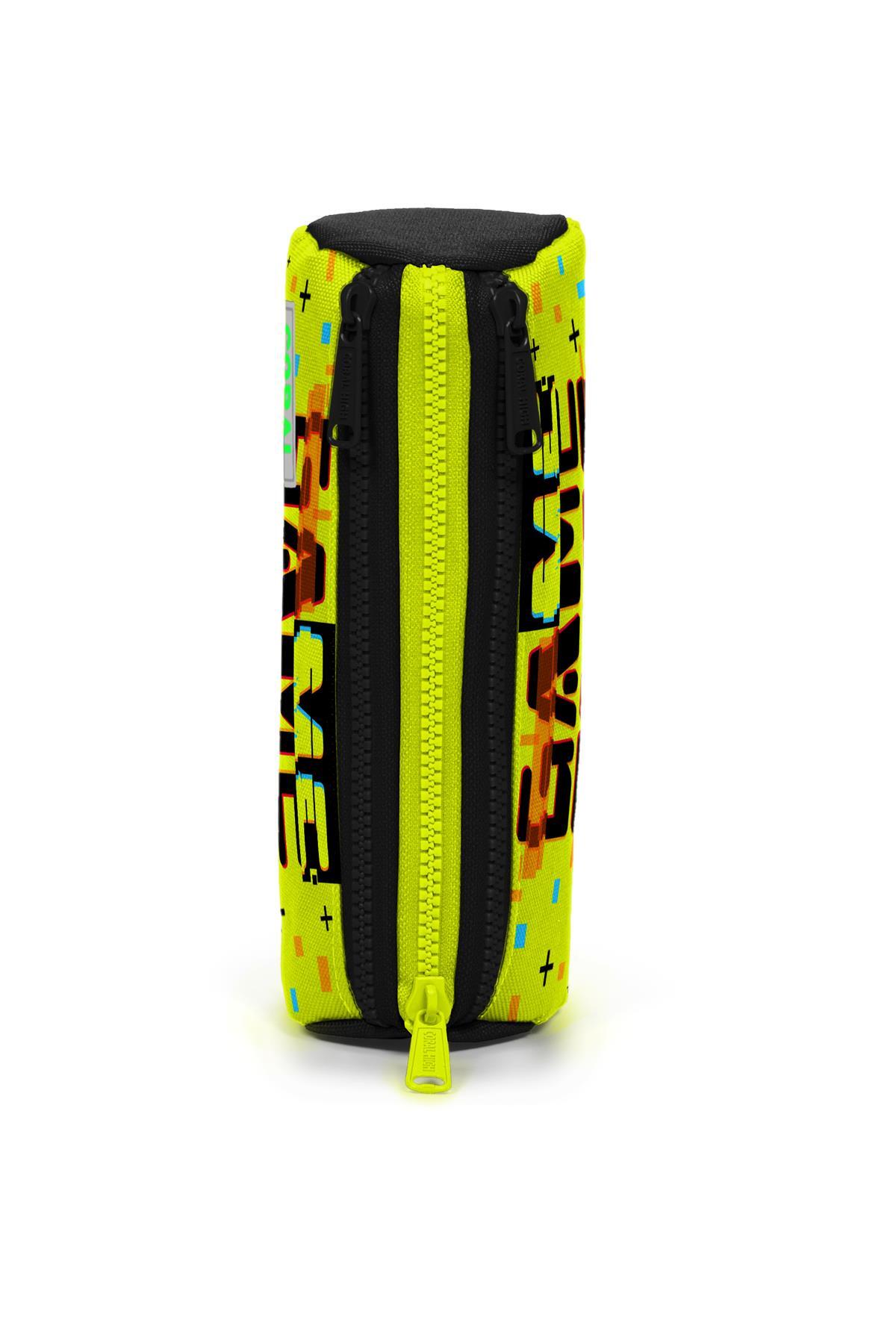 Üç bölmeli, fermuarlı kalem çantası.