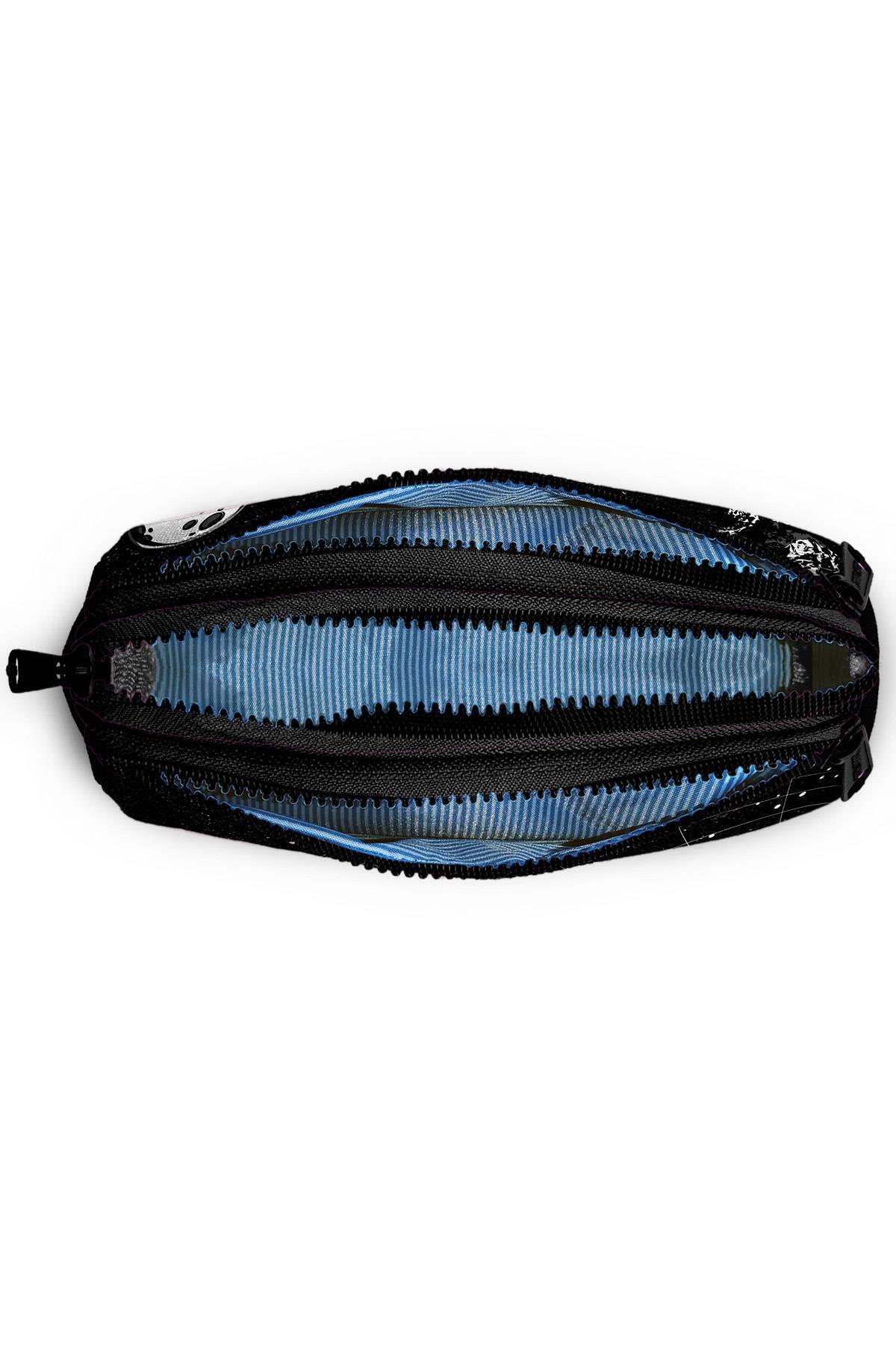 Üç bölmeli, fermuarlı kalem çantası.