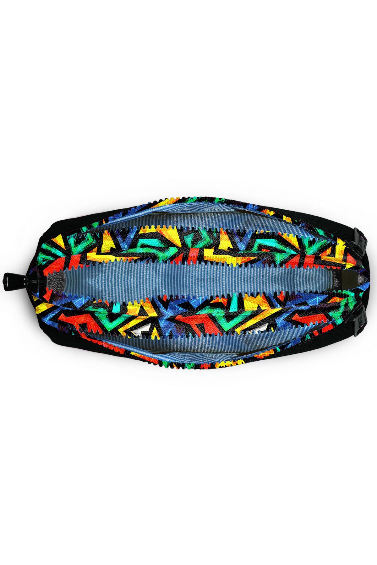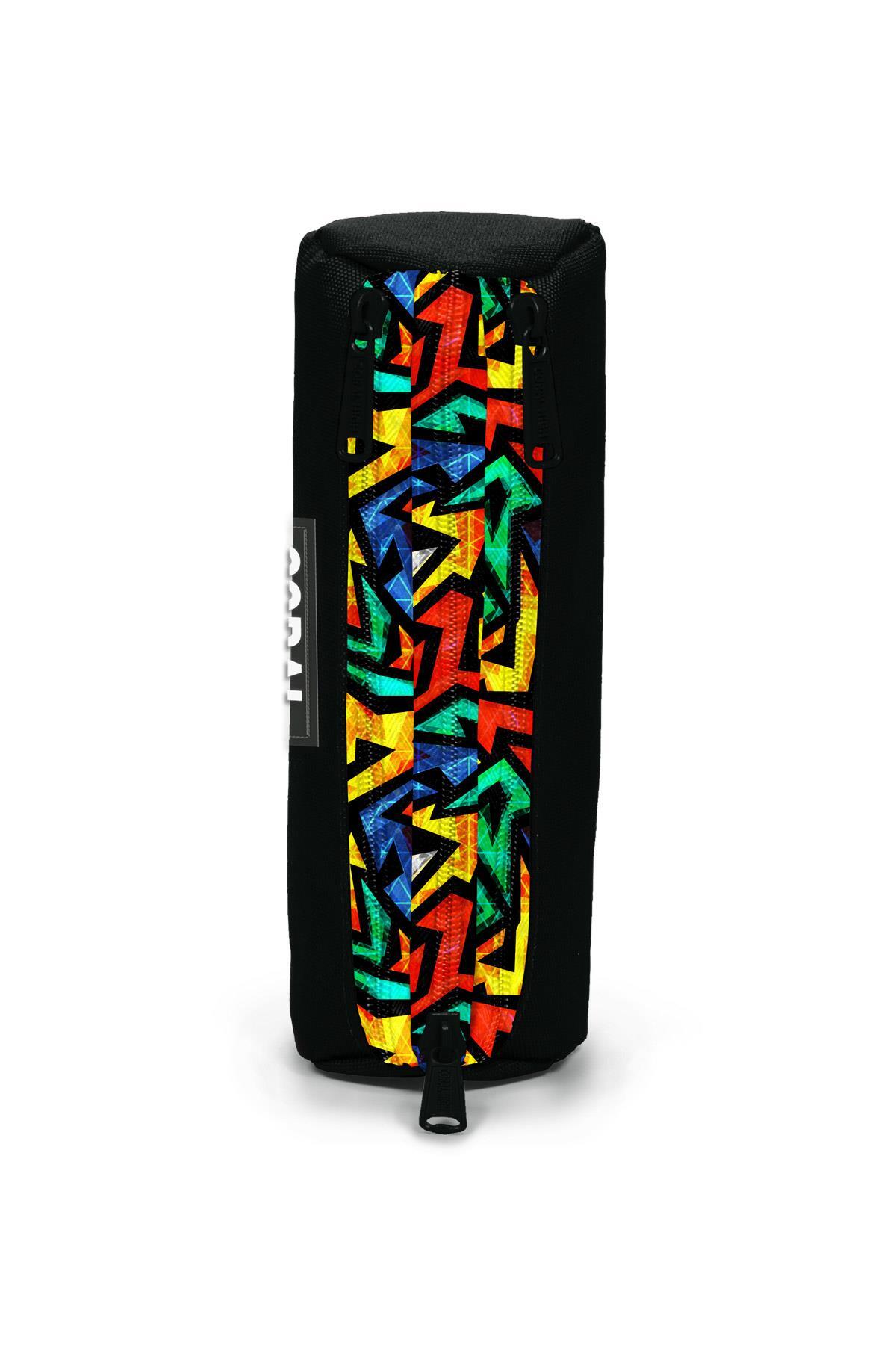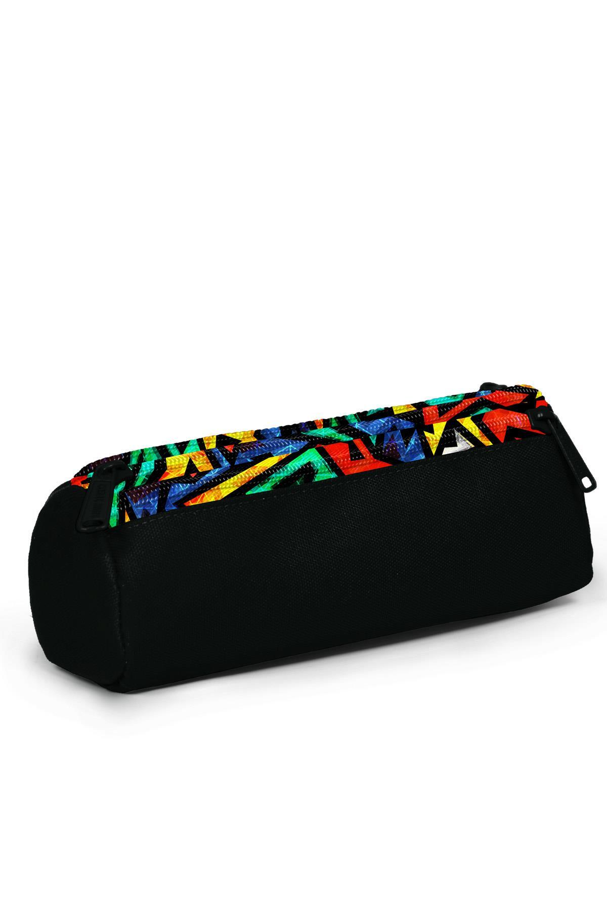 Üç bölmeli, fermuarlı kalem çantası.