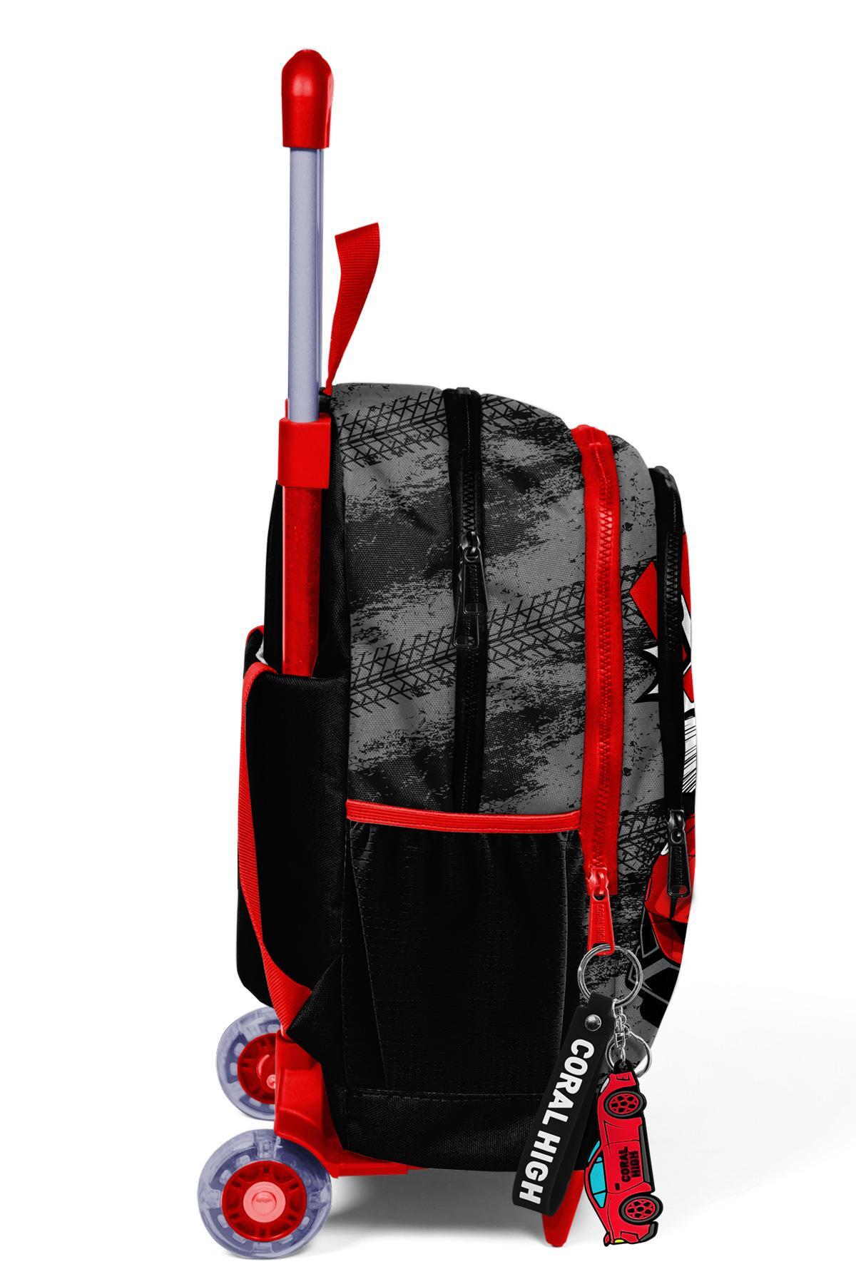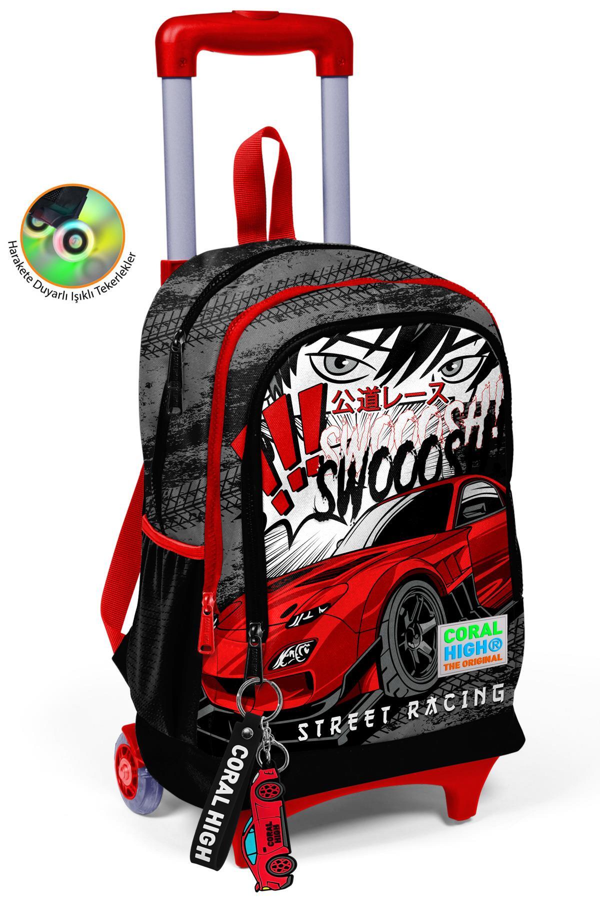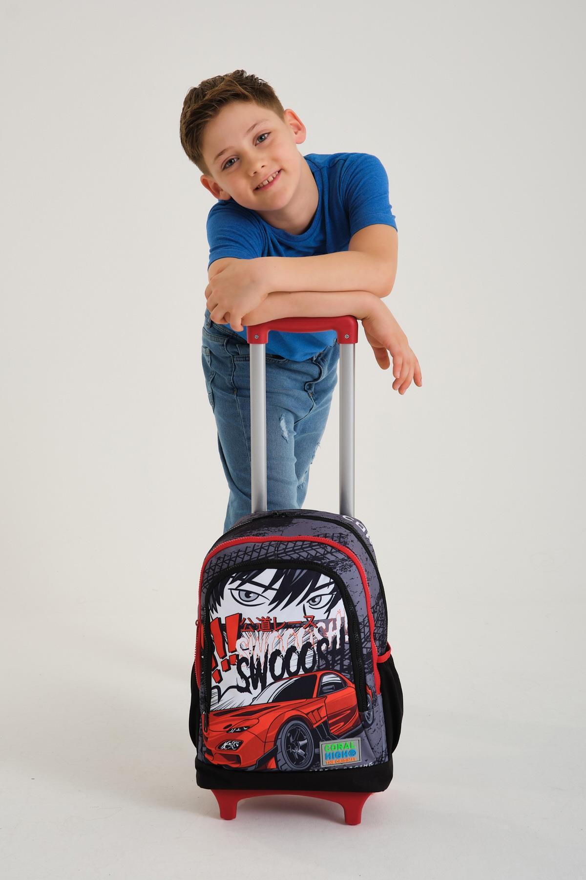 Coral High Kids Siyah Kırmızı Anime Araba Desenli Üç Bölmeli Çekçekli Okul Sırt Çantası 23947