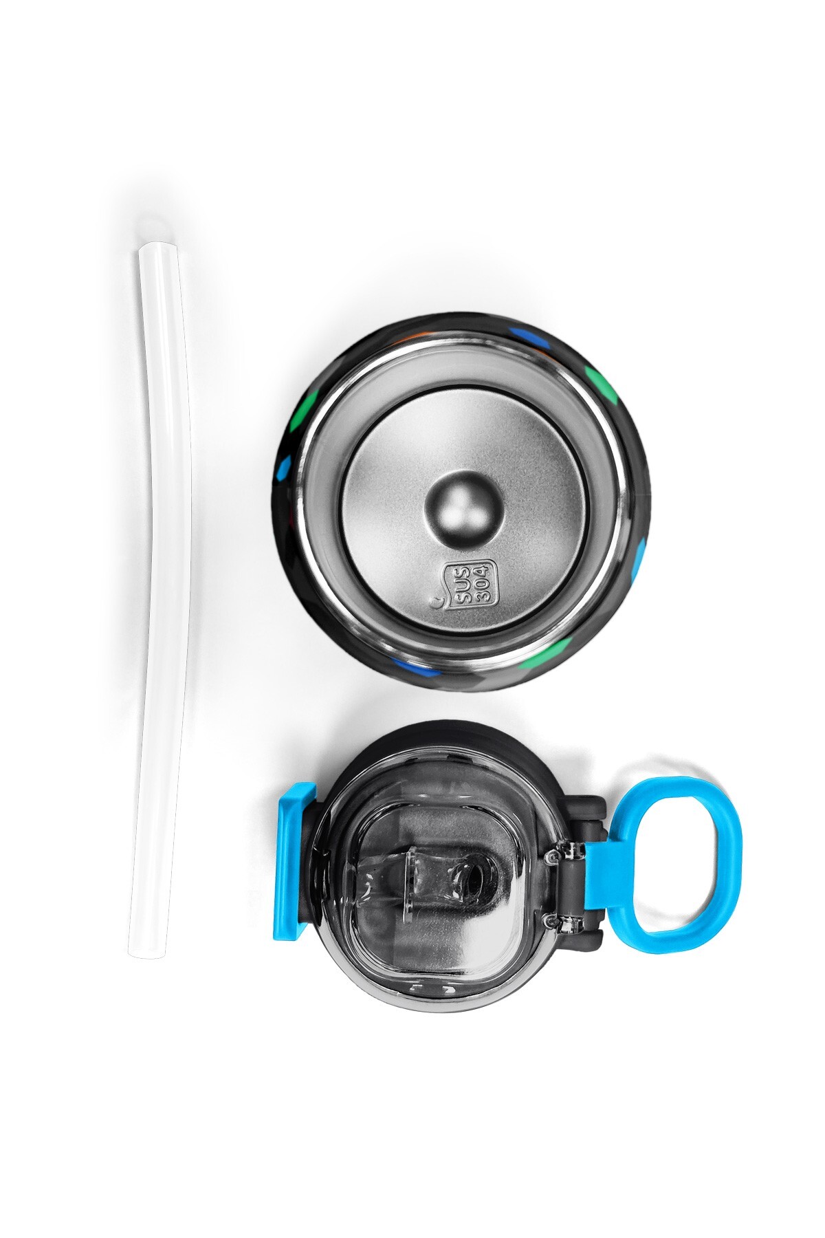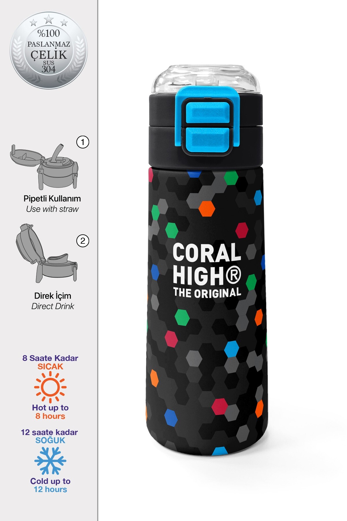 Coral High Kids Siyah Renkli Petek Desenli Pipetli ve Direkt İçim Çelik Termos 500 ml 38110