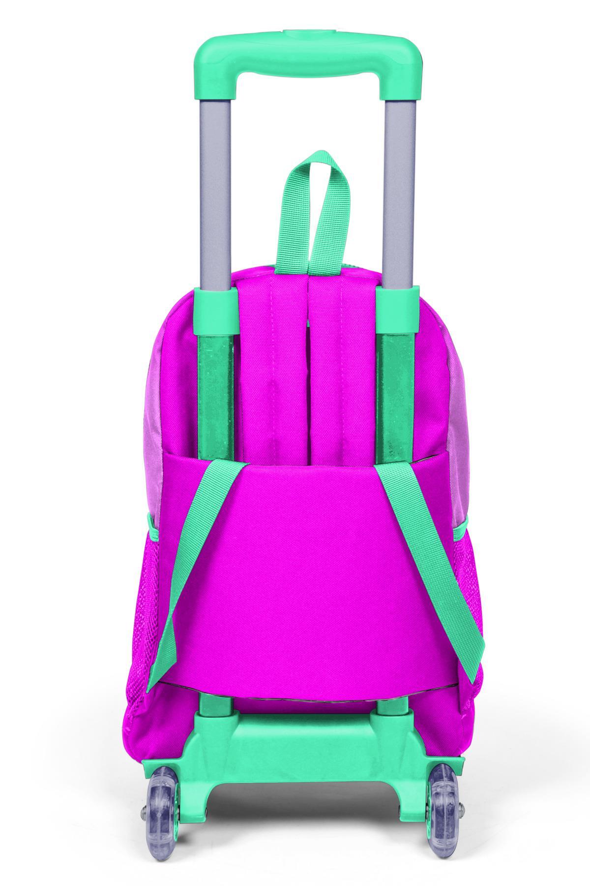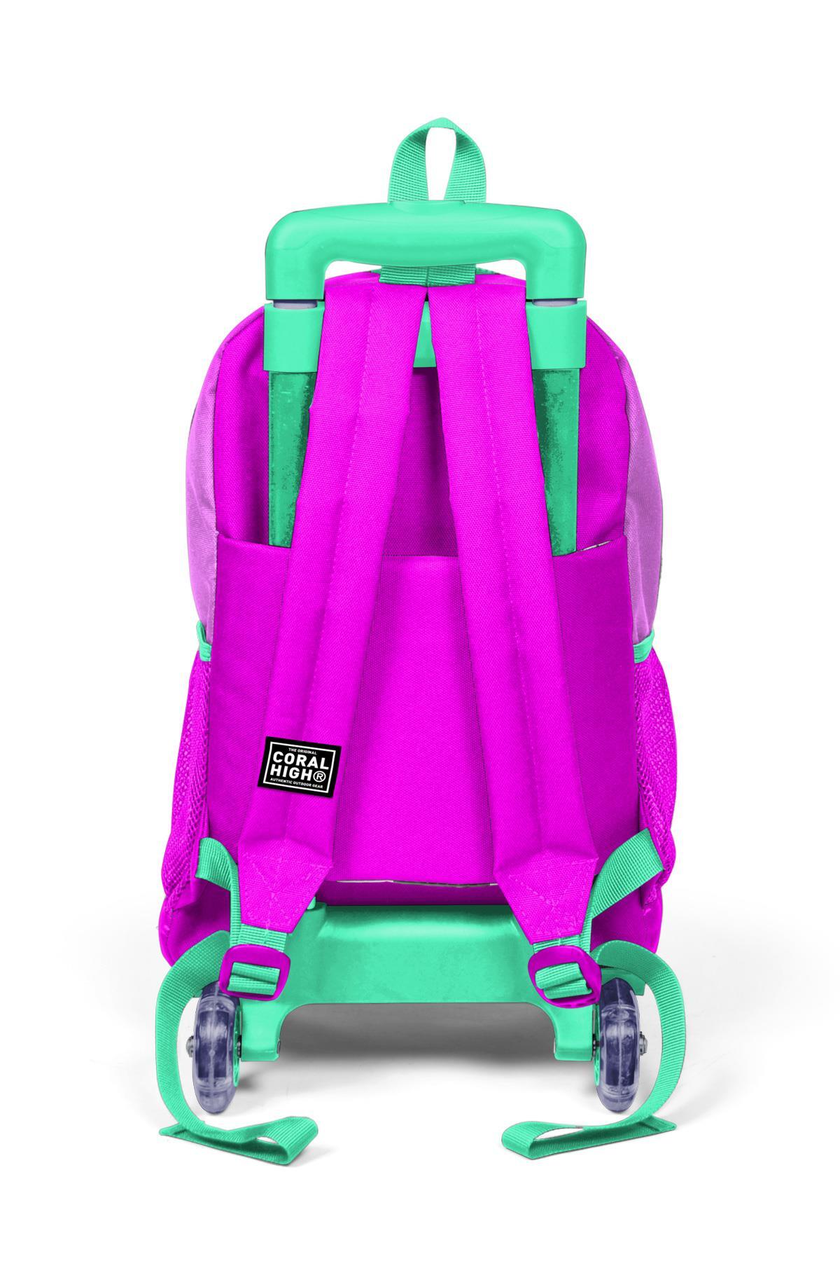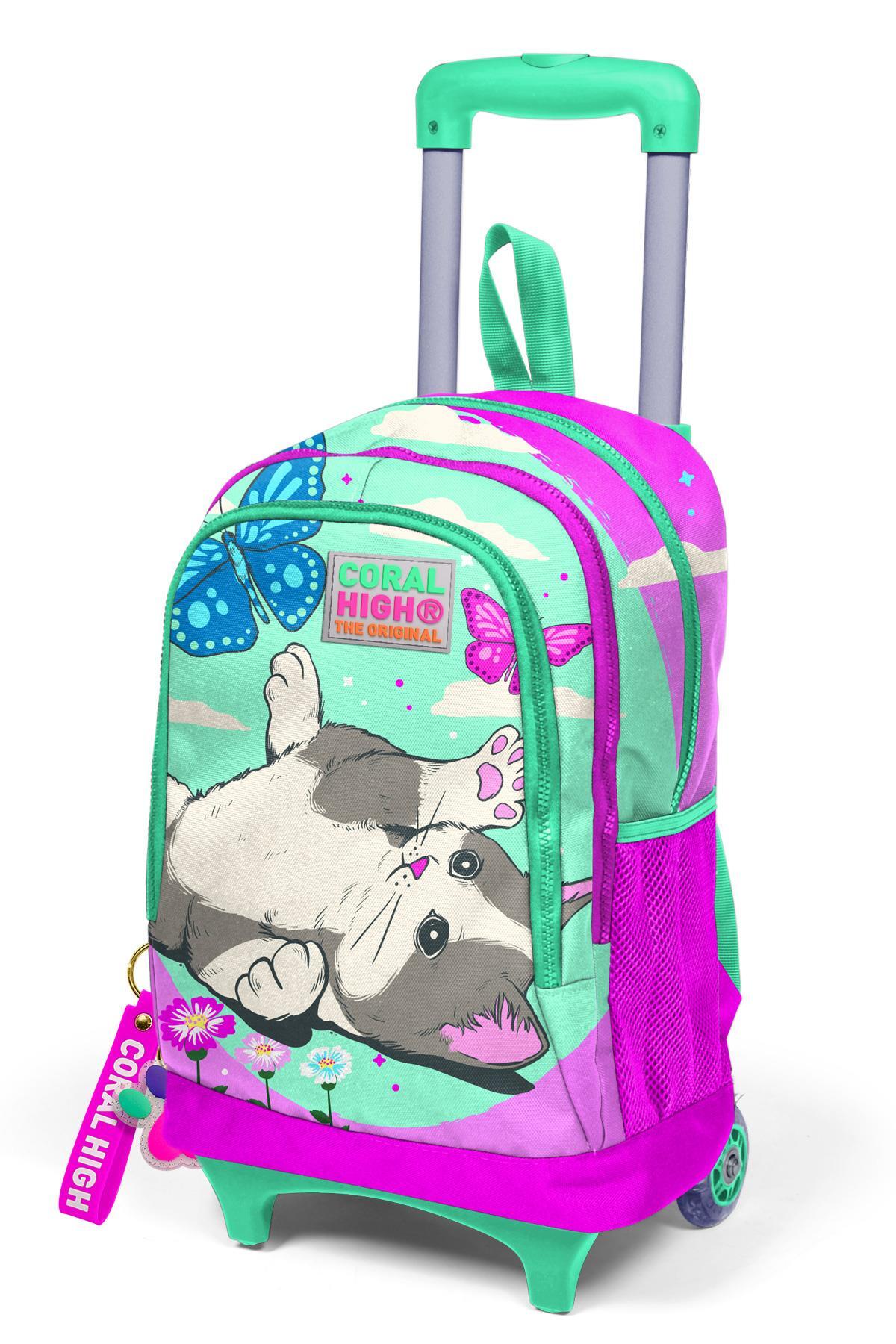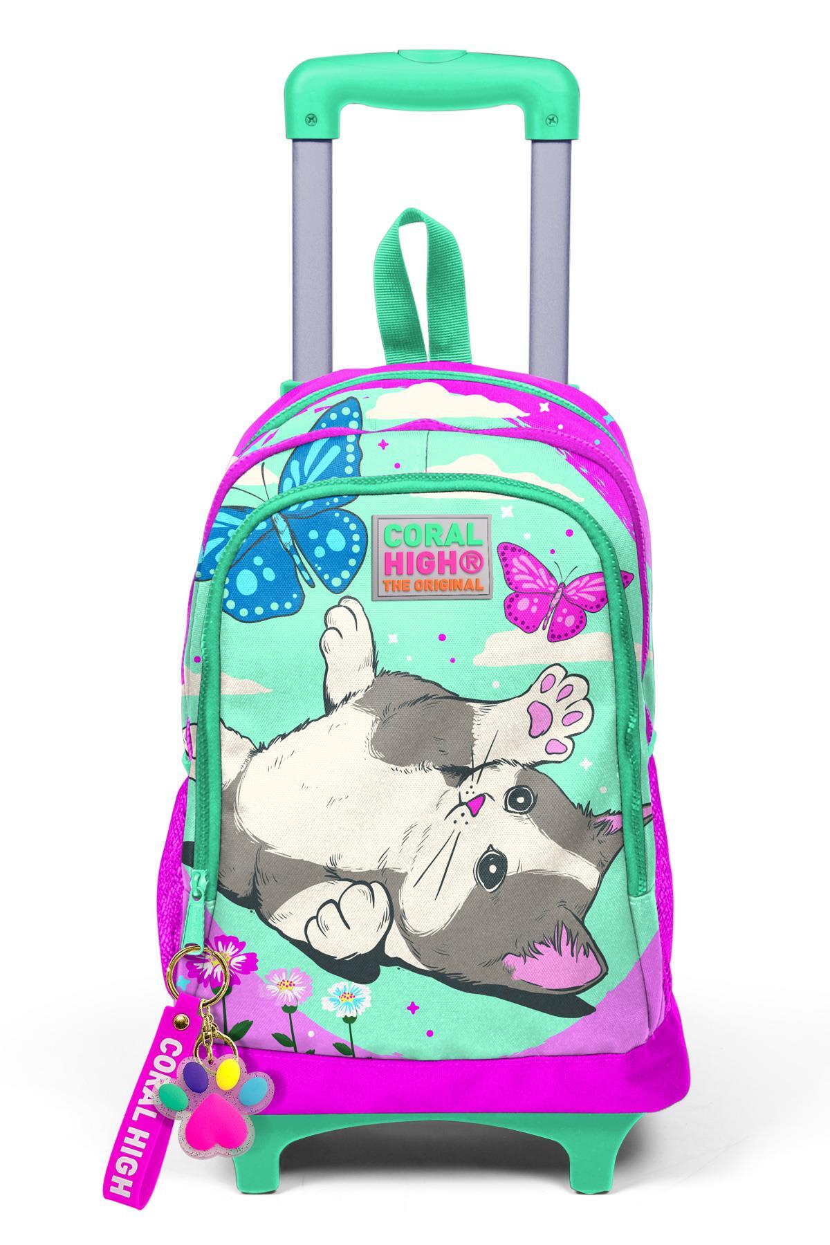 Coral High Kids Su Yeşili Pembe Kedi Desenli Üç Bölmeli Çekçekli Okul Sırt Çantası 23907