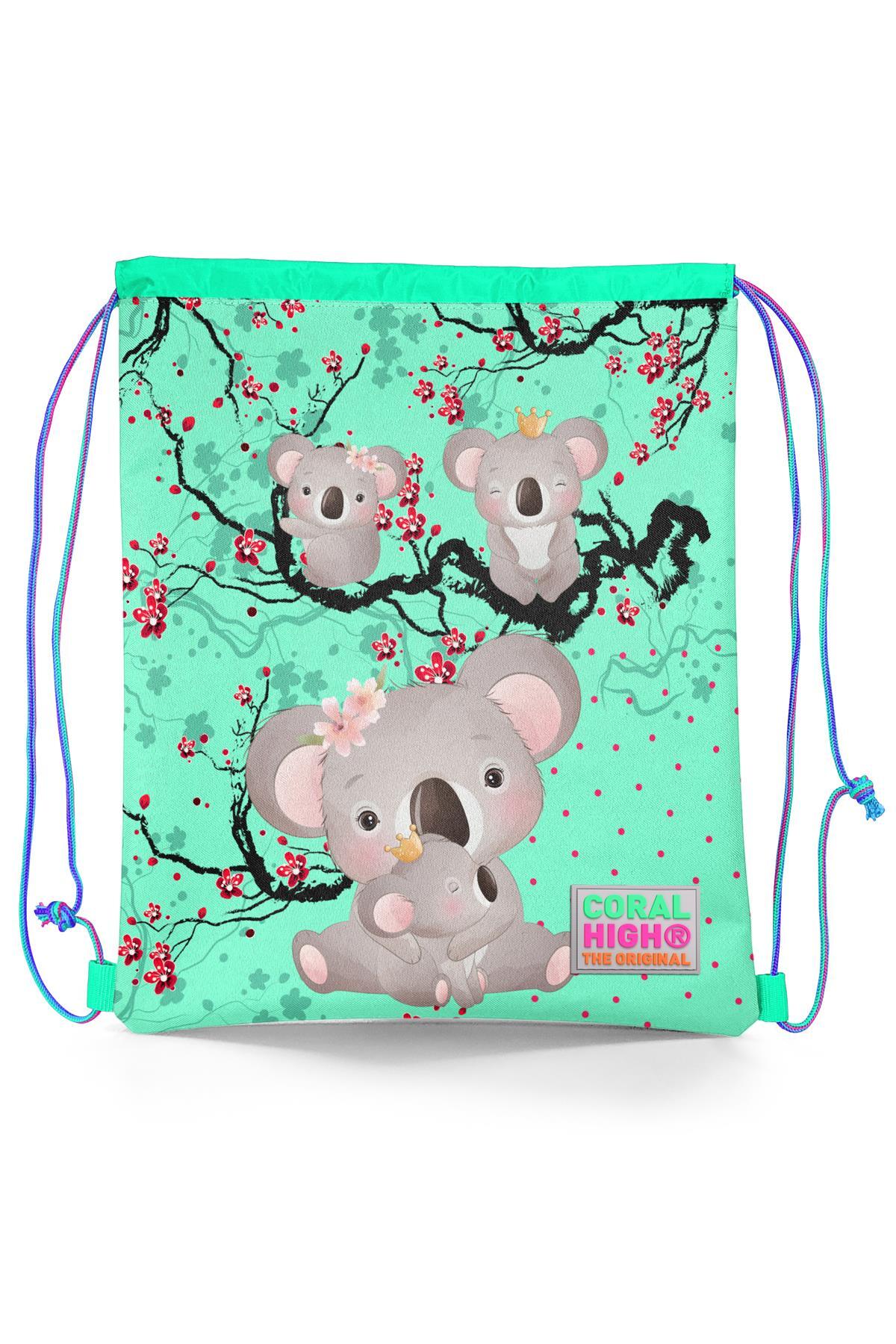 Coral High Kids Su Yeşili Neon Mercan Koala Desenli İpli Büzgülü Sırt Çantası 22469