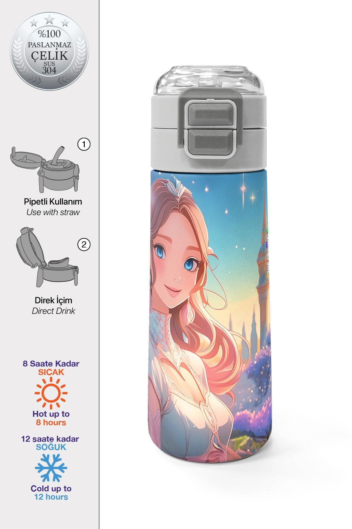 Coral High Kids Turkuaz Pembe Anime Kız Desenli Pipetli ve Direkt İçim Çelik Termos 500 ml 31858