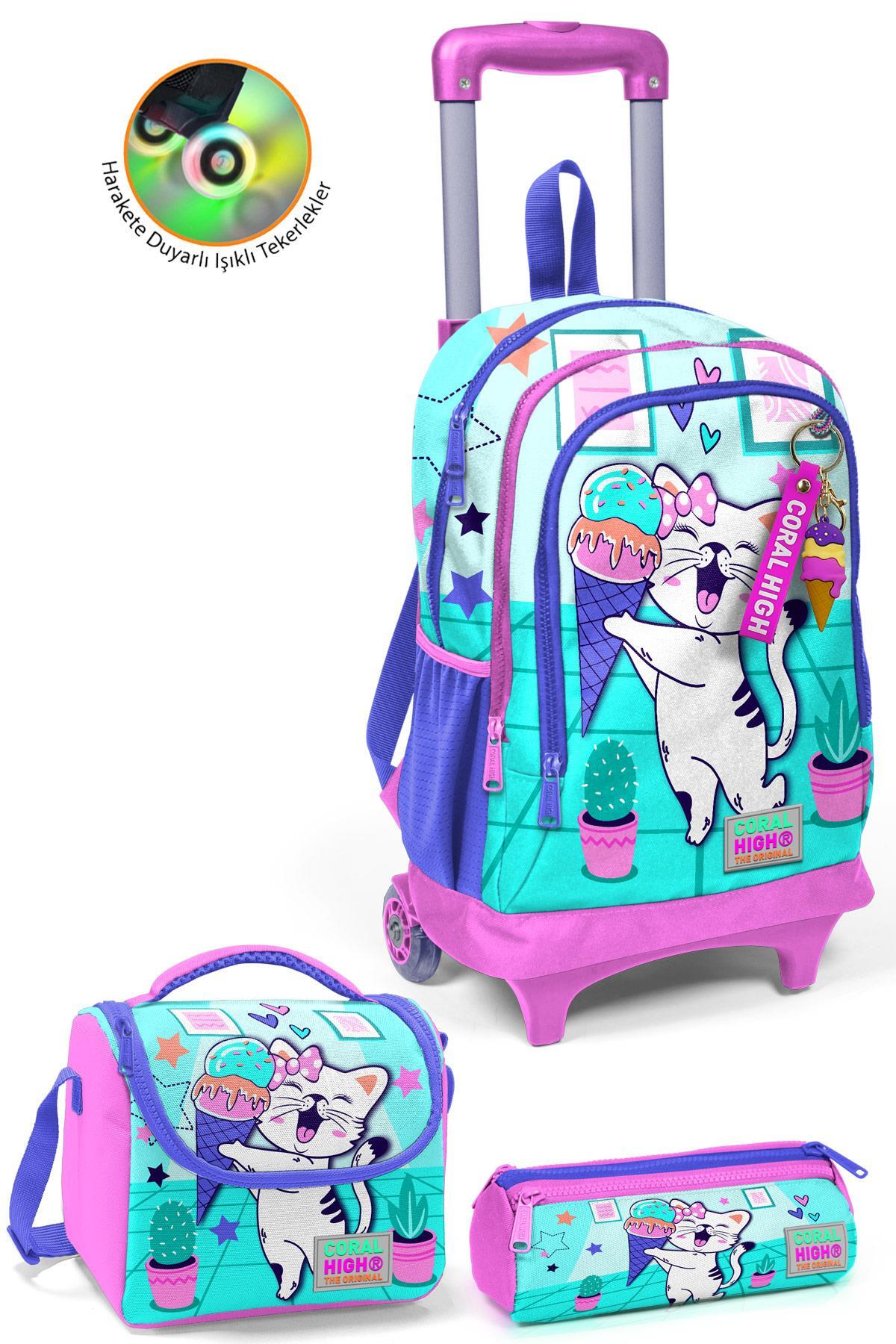 Coral High Kids Turkuaz Pembe Dondurmalı Kedi Desenli Üç Bölmeli Çekçekli 3'lü Çanta Seti SET0123951