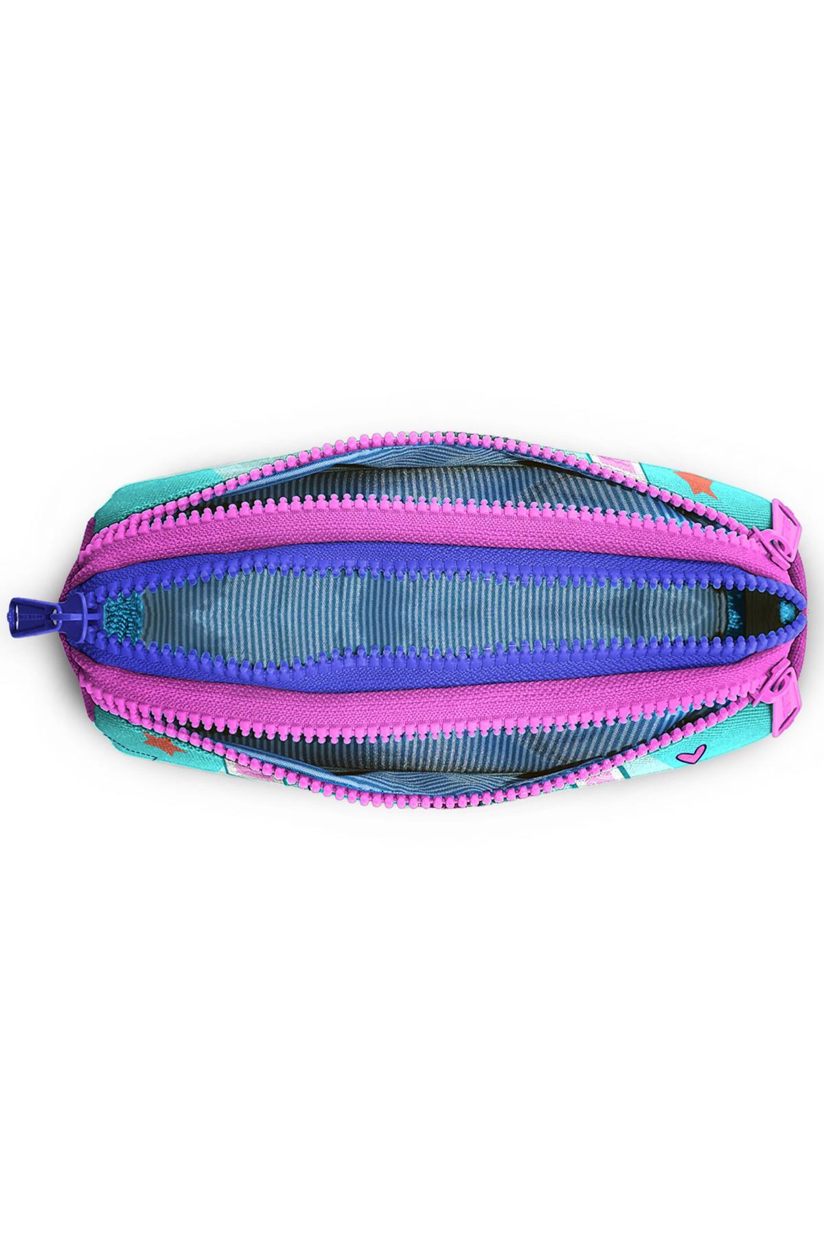 Üç bölmeli, fermuarlı kalem çantası.