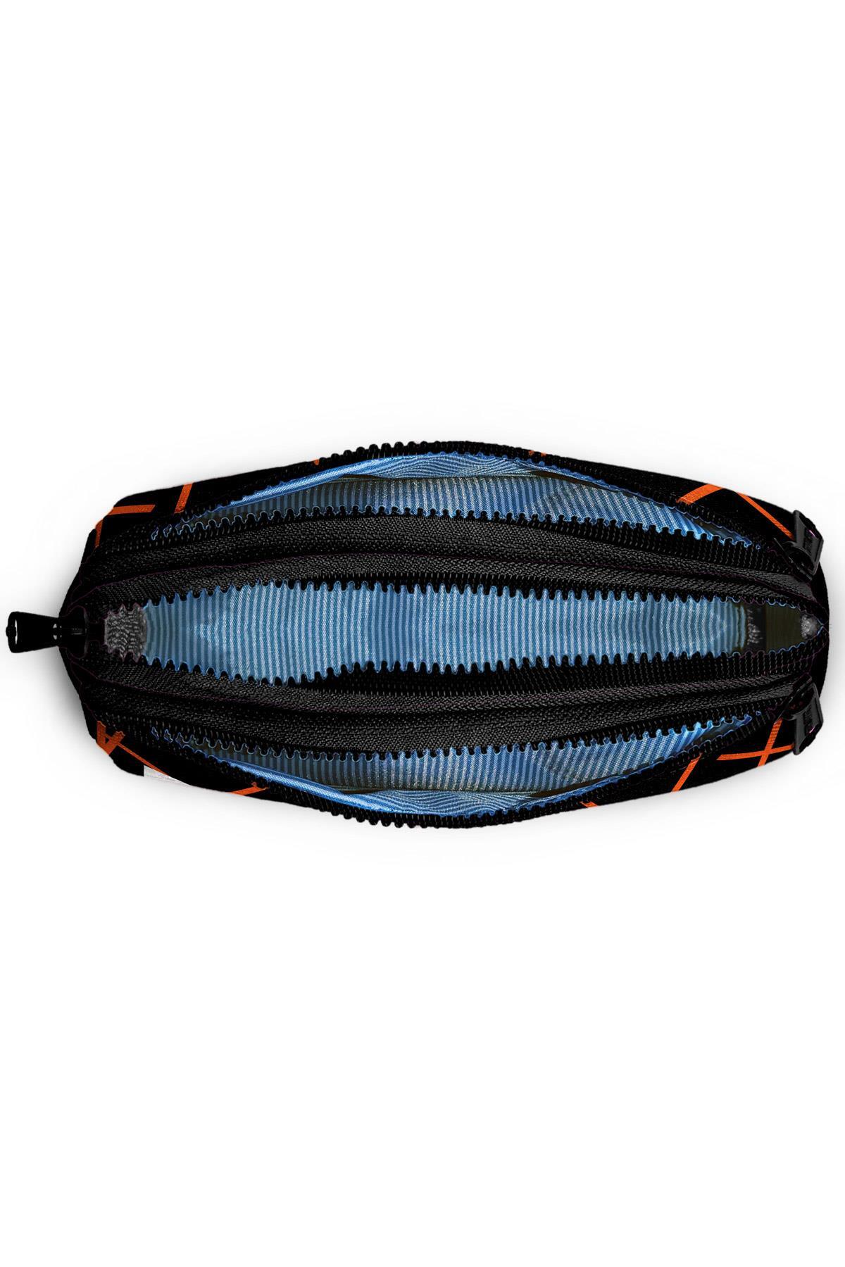 Üç bölmeli, fermuarlı kalem çantası.