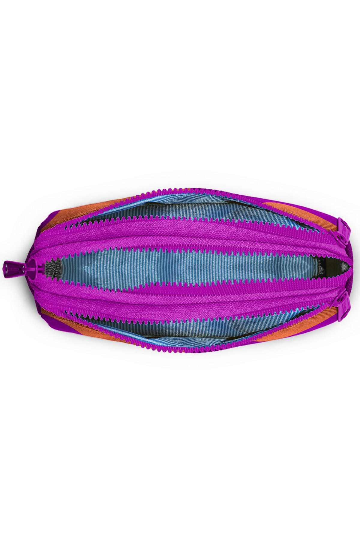 Üç bölmeli, fermuarlı kalem çantası.