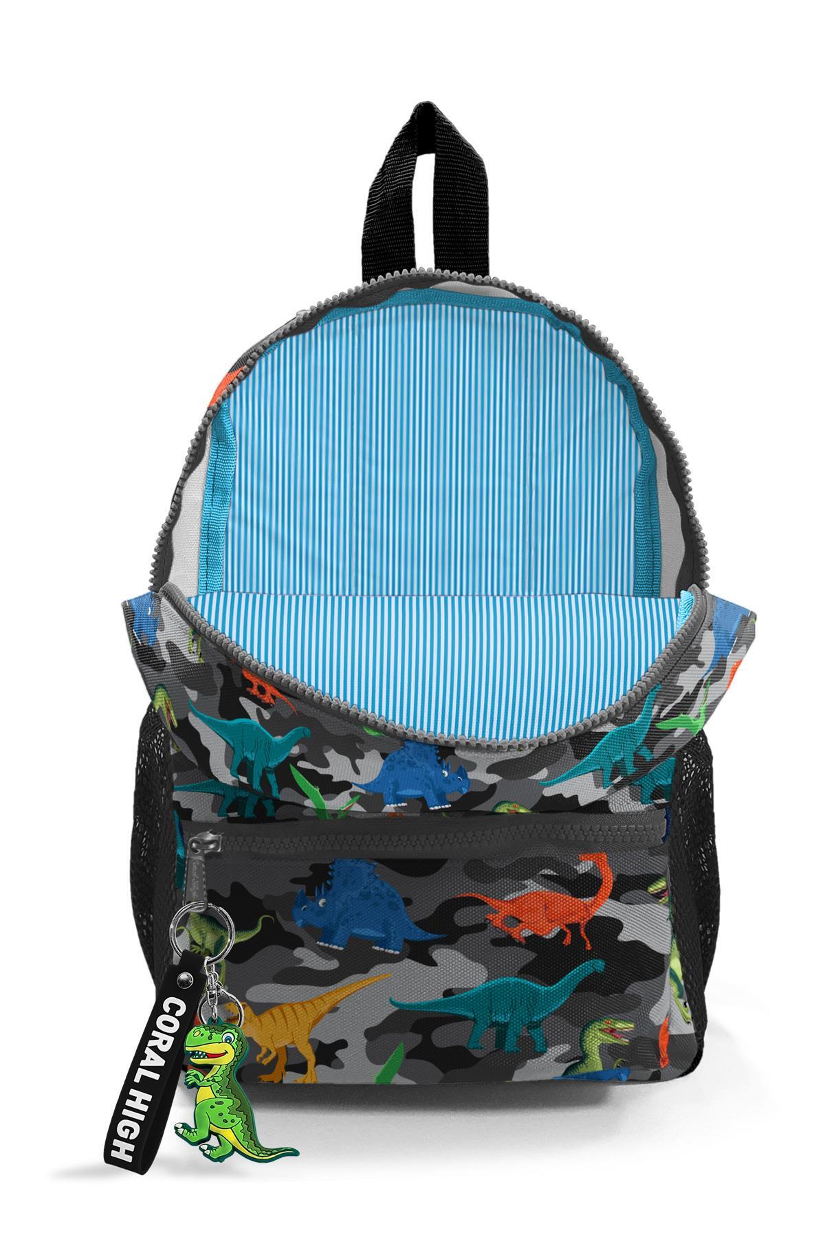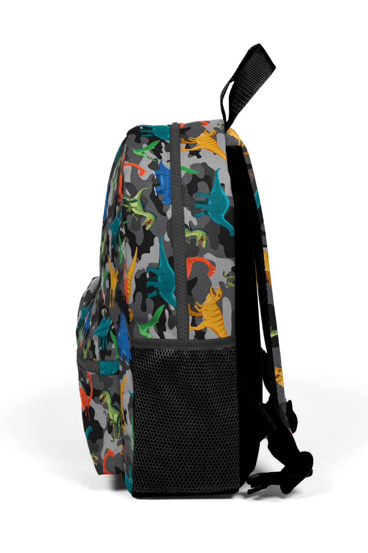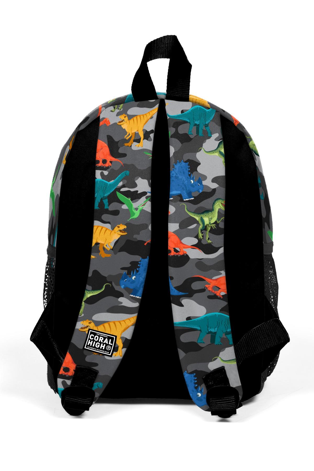 Minik Yuva Sırt Çantası Koyu Gri Siyah Kamuflaj Dinozor Desenli İki Bölmeli 23350