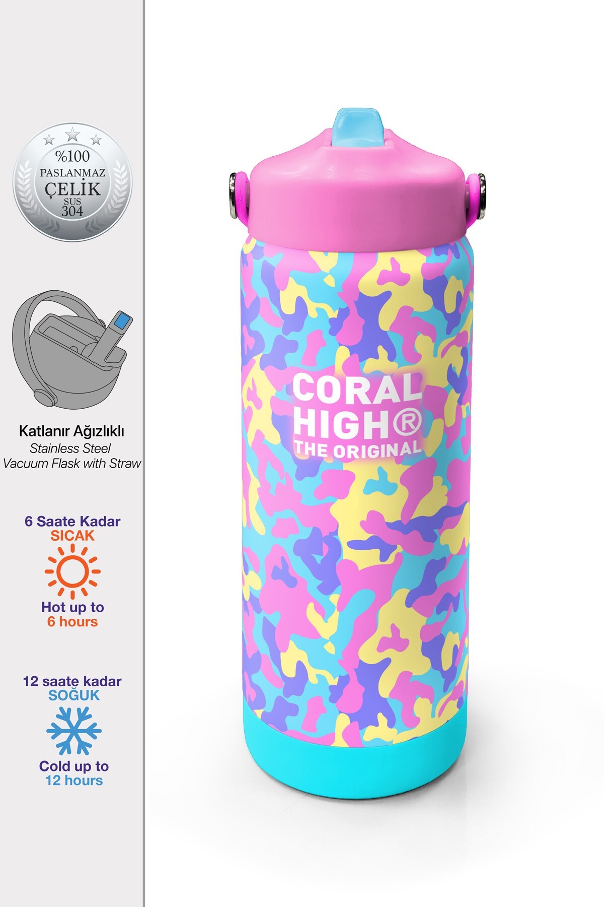 Coral High Pembe Sarı Lavanta Kamuflaj Desenli Katlanır Ağızlıklı Çelik Termos 650 ml 38301