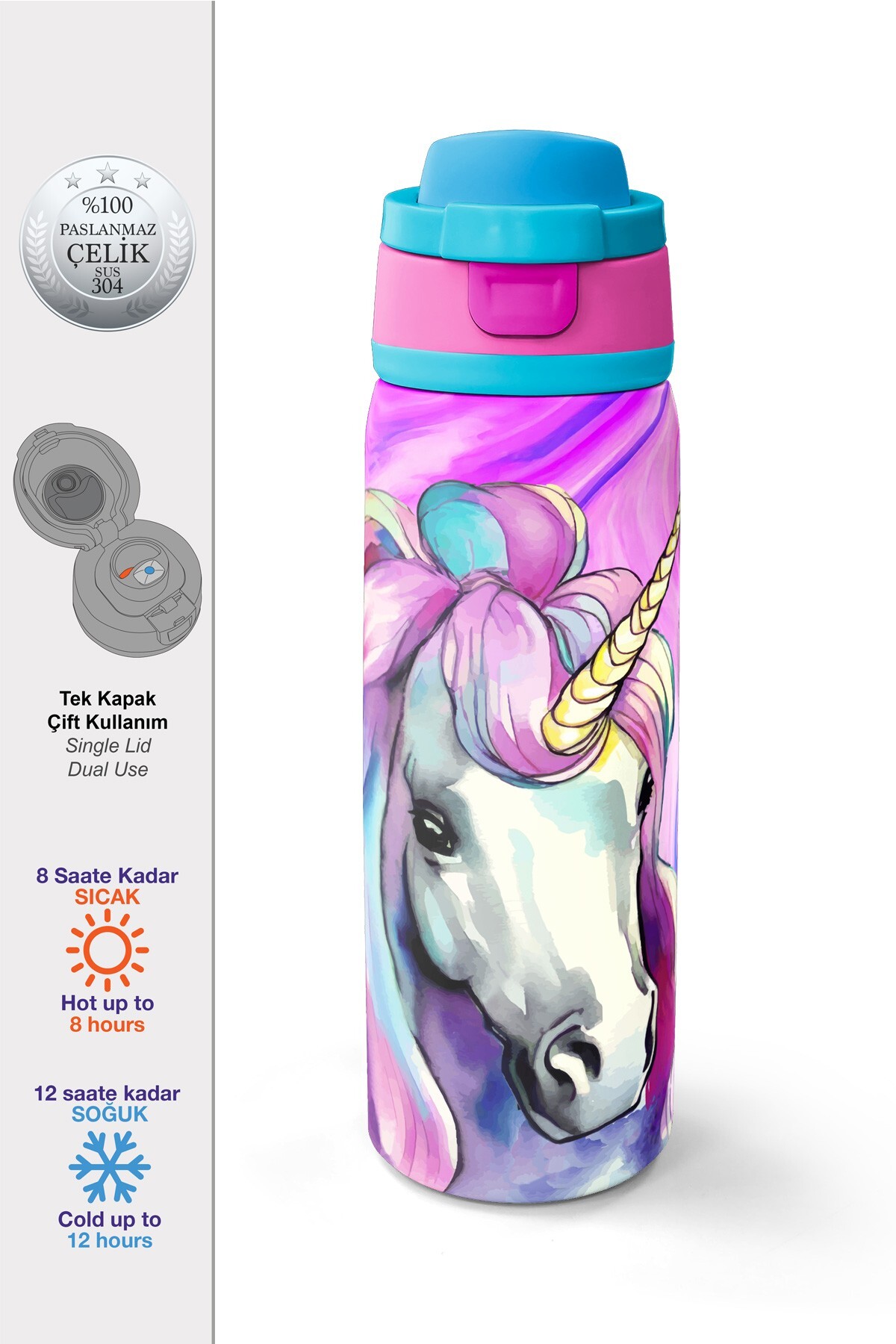 Coral High Pembe Unıcorn Desenli Pipetli ve Direkt İçim Çelik Termos 800 ml 38523