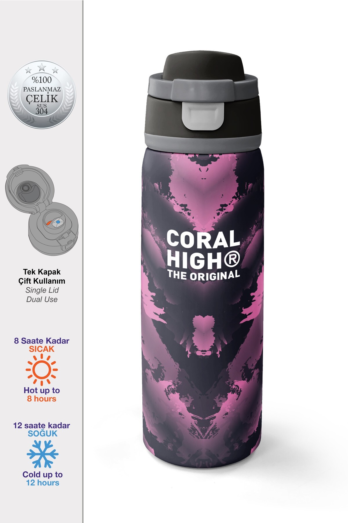 Coral High Siyah Desenli Pipetli ve Direkt İçim Çelik Termos 800 ml 38571