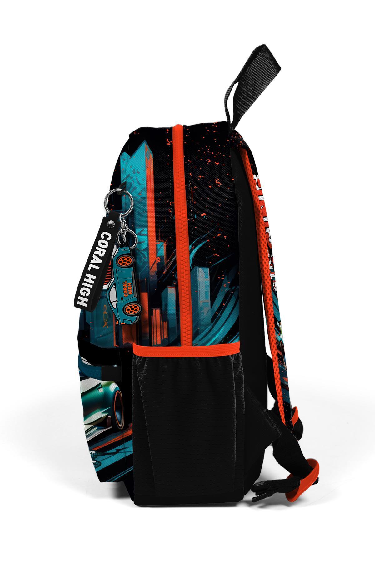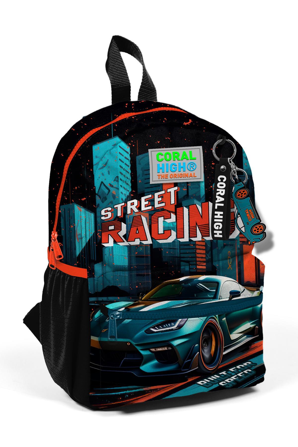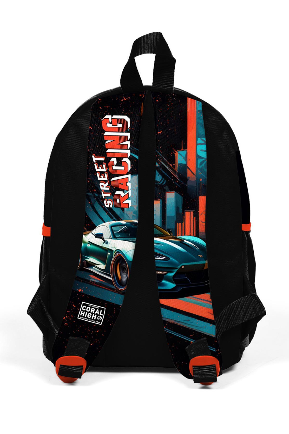 Minik Yuva Sırt Çantası Siyah Nefti Yarış Arabası Desenli İki Bölmeli 23565